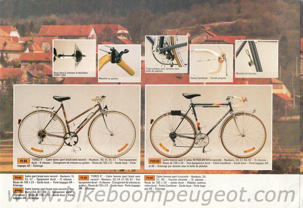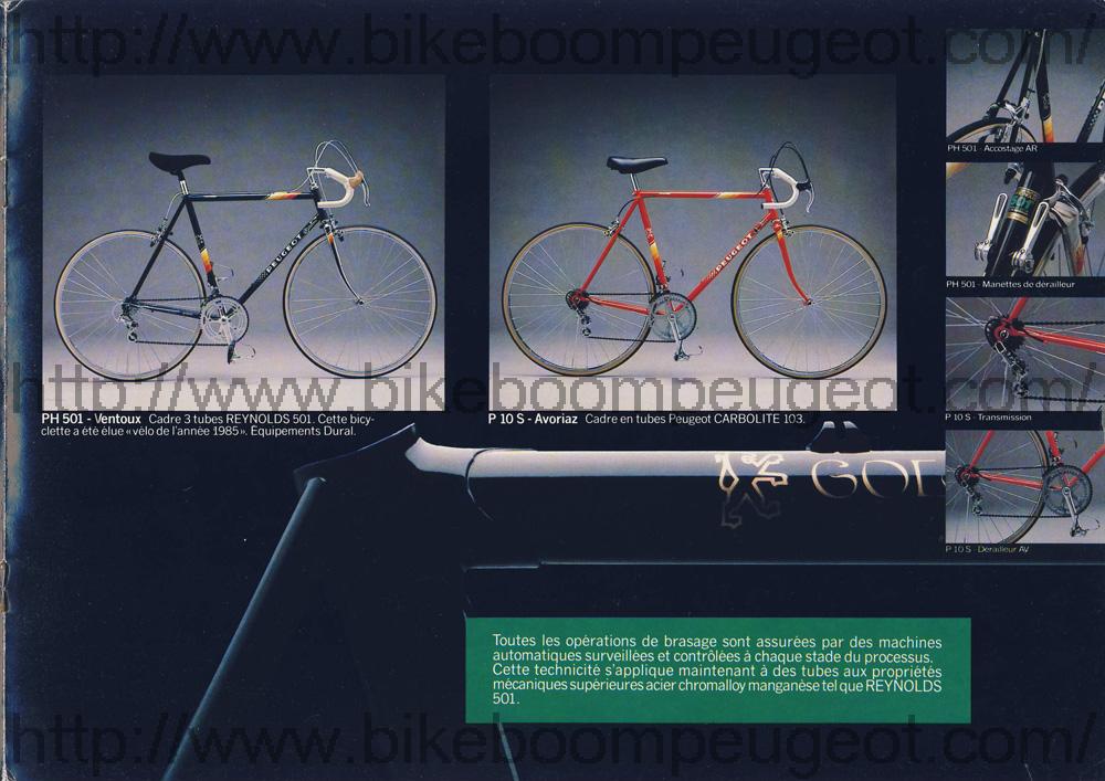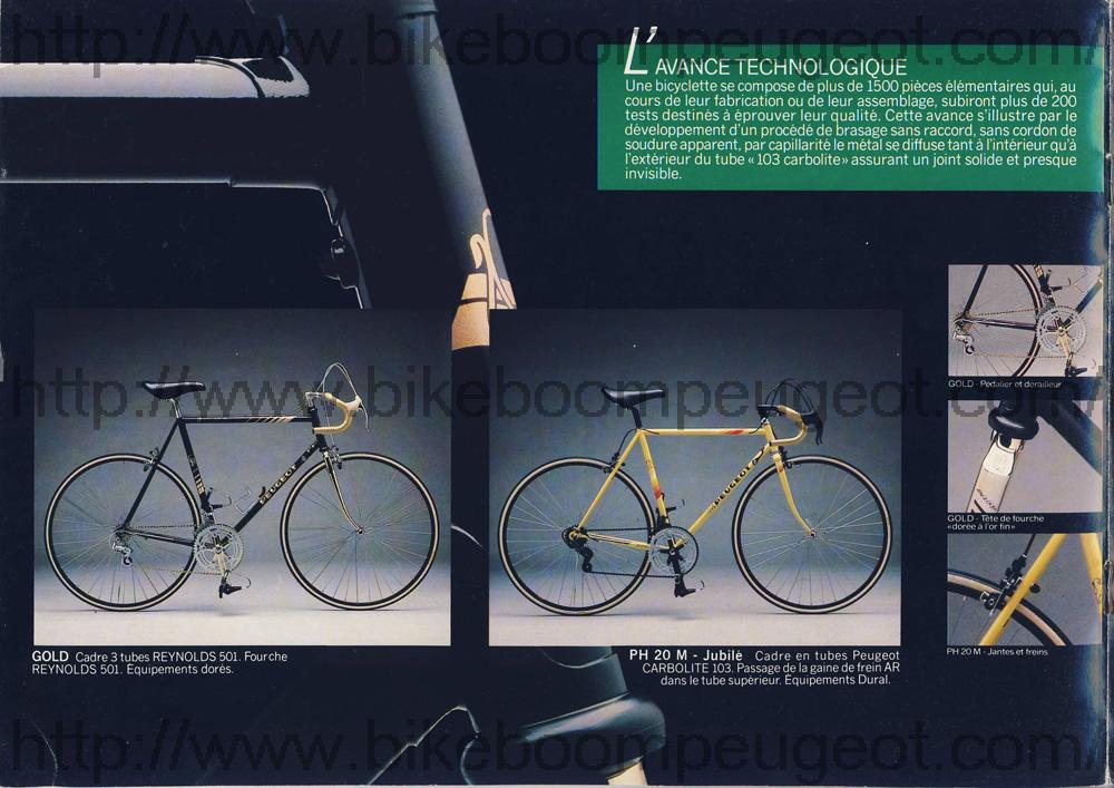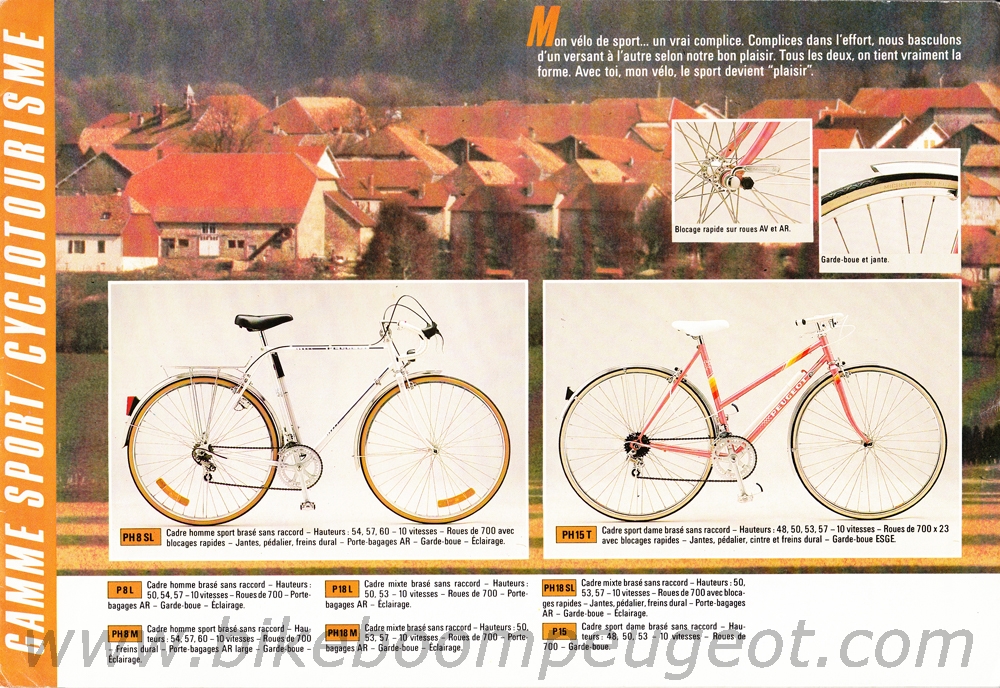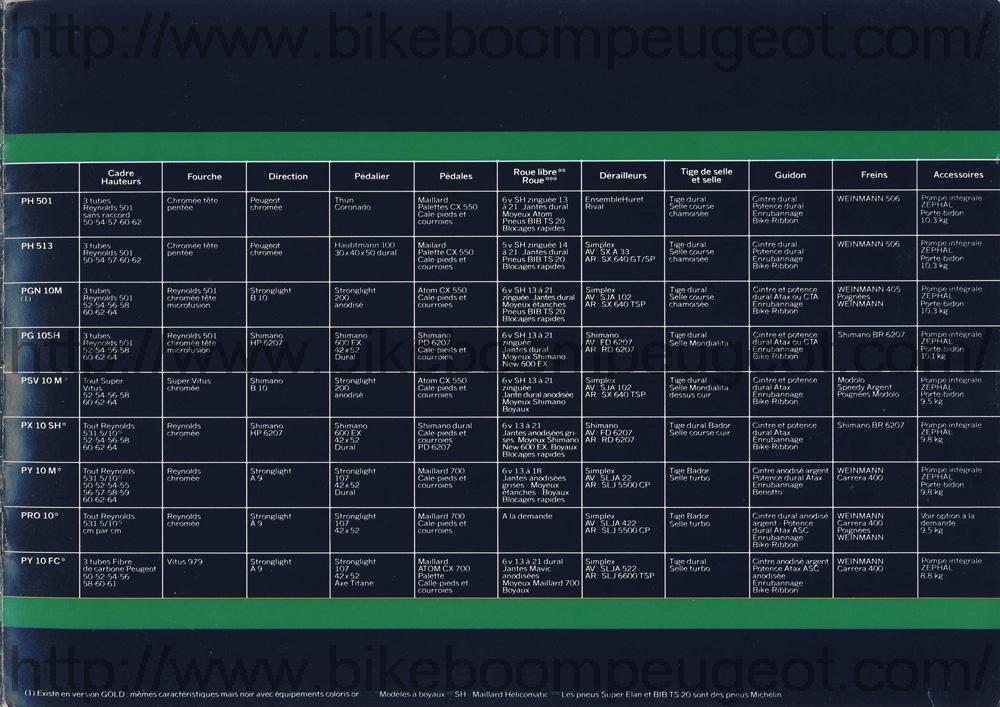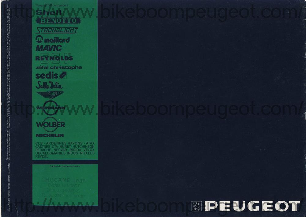 This Gamme Course brochure is one in a series of 3 undated mid-1980s French brochures (based on the similarity of models in dated USA and Dutch brochures) nested between the dated 1985 and 1989 French brochures. The first brochure in this series does not have aluminum or carbon frames and is believed to be of 1986 vintage, the second has aluminum frames and is believed to be of 1987 vintage, and the third has both aluminum and carbon frames and is believed to be of 1988 vintage. Furthermore, the dated 1985 French brochure does not have aluminum or carbon frames, and the dated 1989 brochure does. The evolution of model names and numbers in the French brochures, and their similarity with dated USA and Dutch brochures also supports this hypothesis.