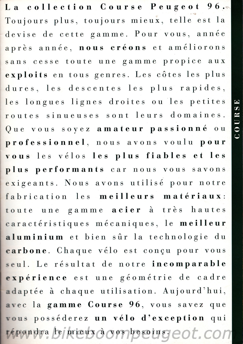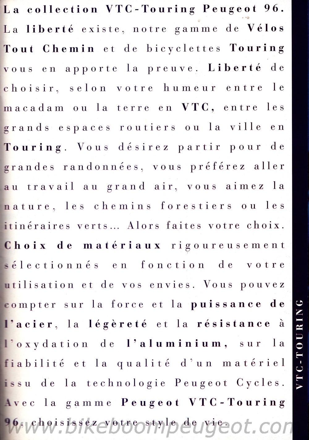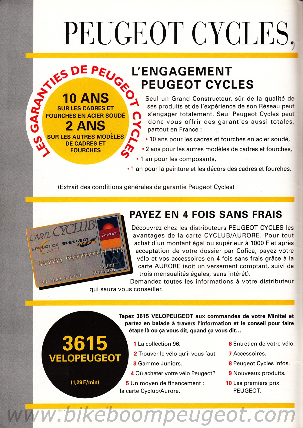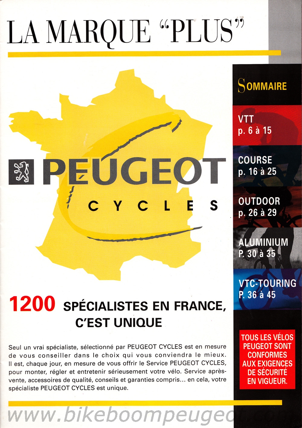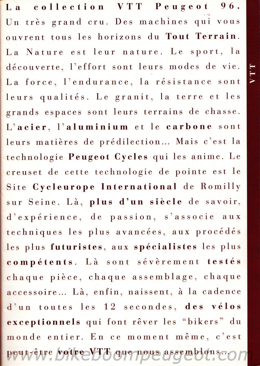 This brochure written in French was published in 1996, based on the text in the publication (e.g., "La collection VTT Peugeot 96."), by the CycleEurope Groupe and includes the full line of non-performance Peugeot bicycles. The CycleEurope Groupe also published in 1996 a Team Line brochure only covering Peugeot's a la carte performance bicycles.