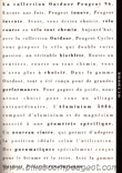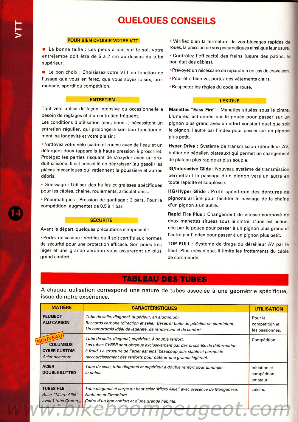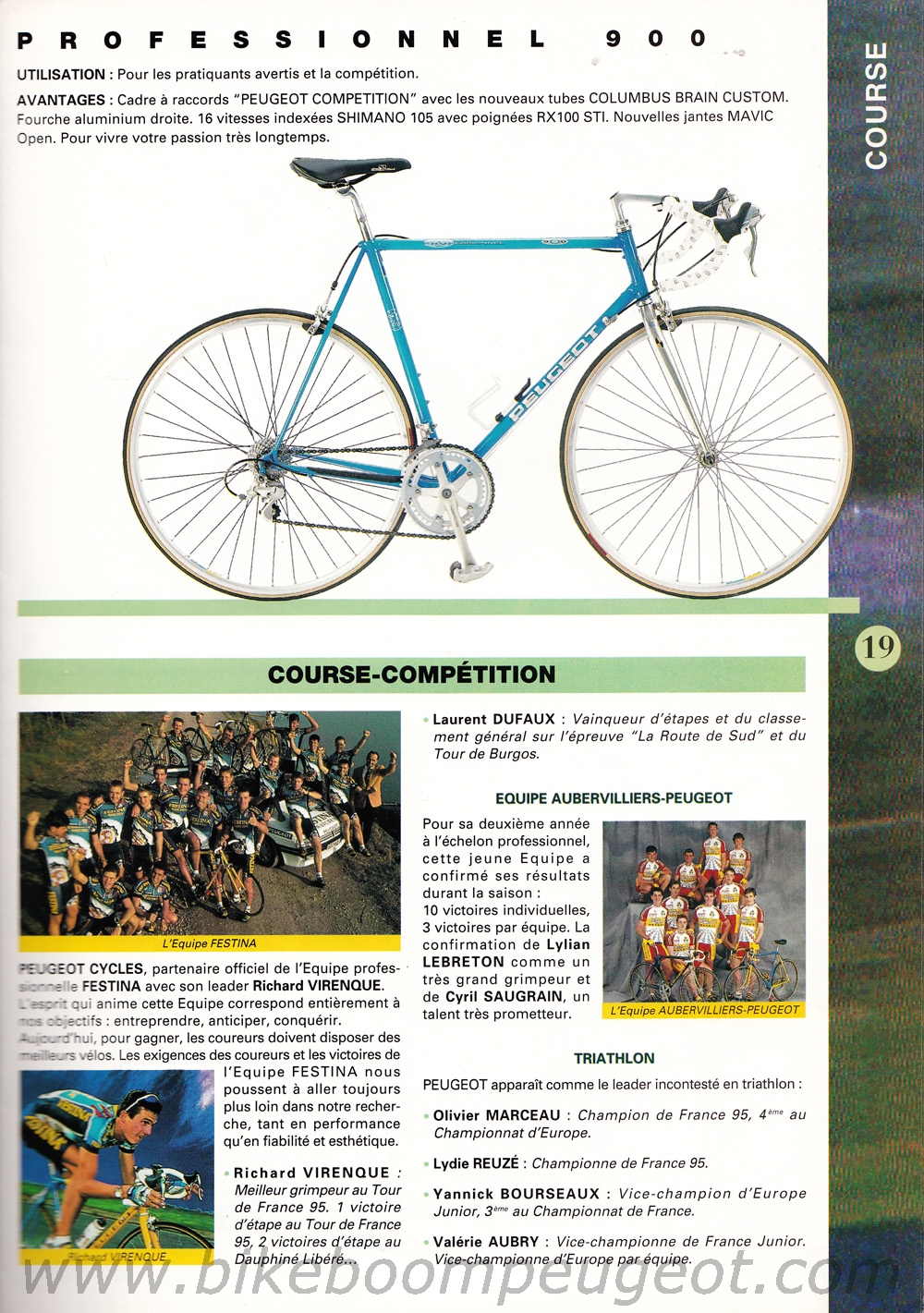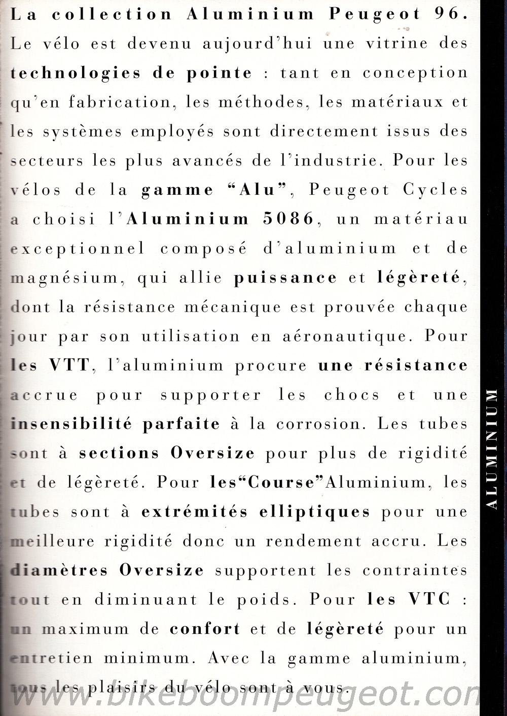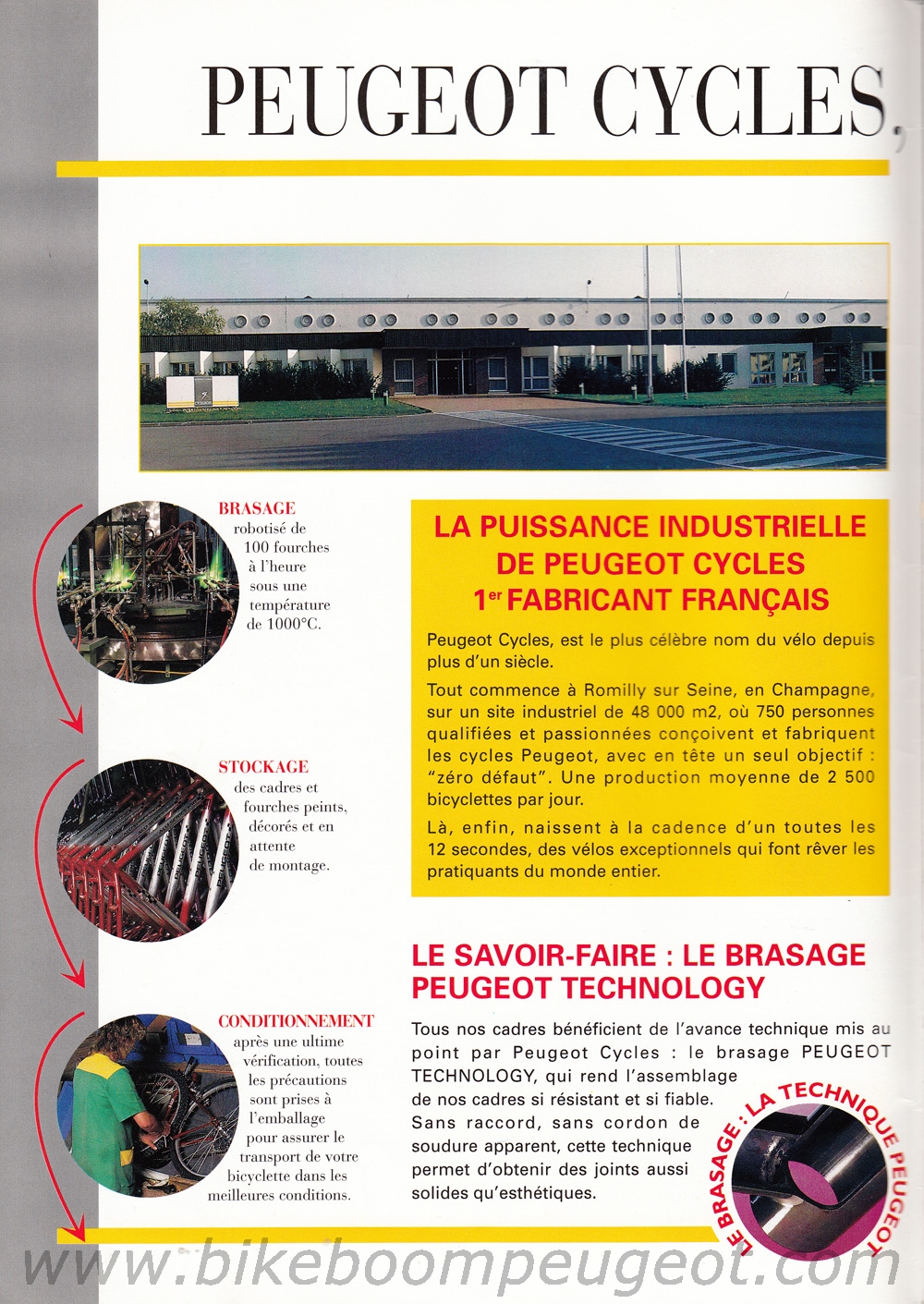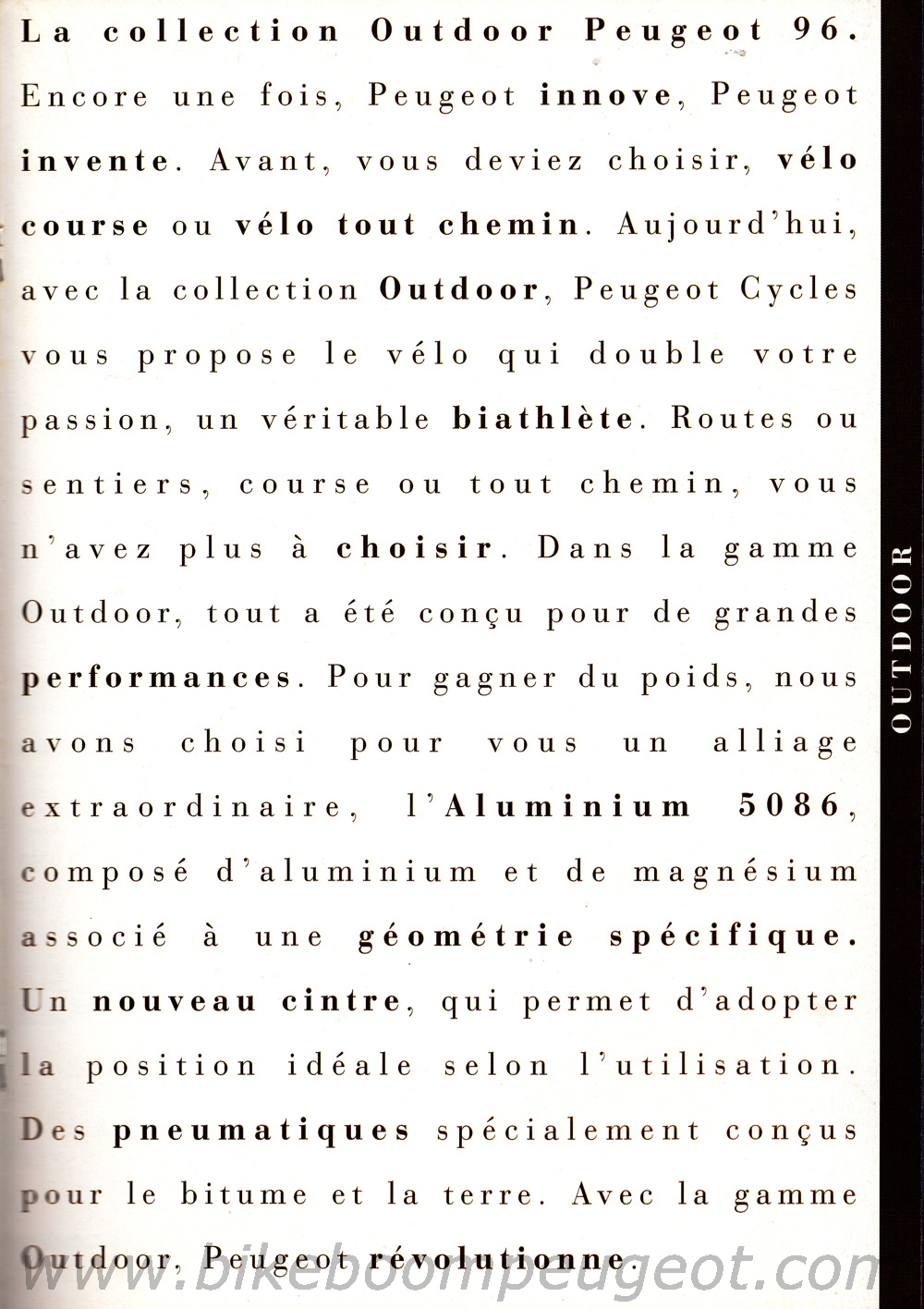 This brochure written in French was published in 1996, based on the text in the publication (e.g., "La collection VTT Peugeot 96."), by the CycleEurope Groupe and includes the full line of non-performance Peugeot bicycles. The CycleEurope Groupe also published in 1996 a Team Line brochure only covering Peugeot's a la carte performance bicycles.