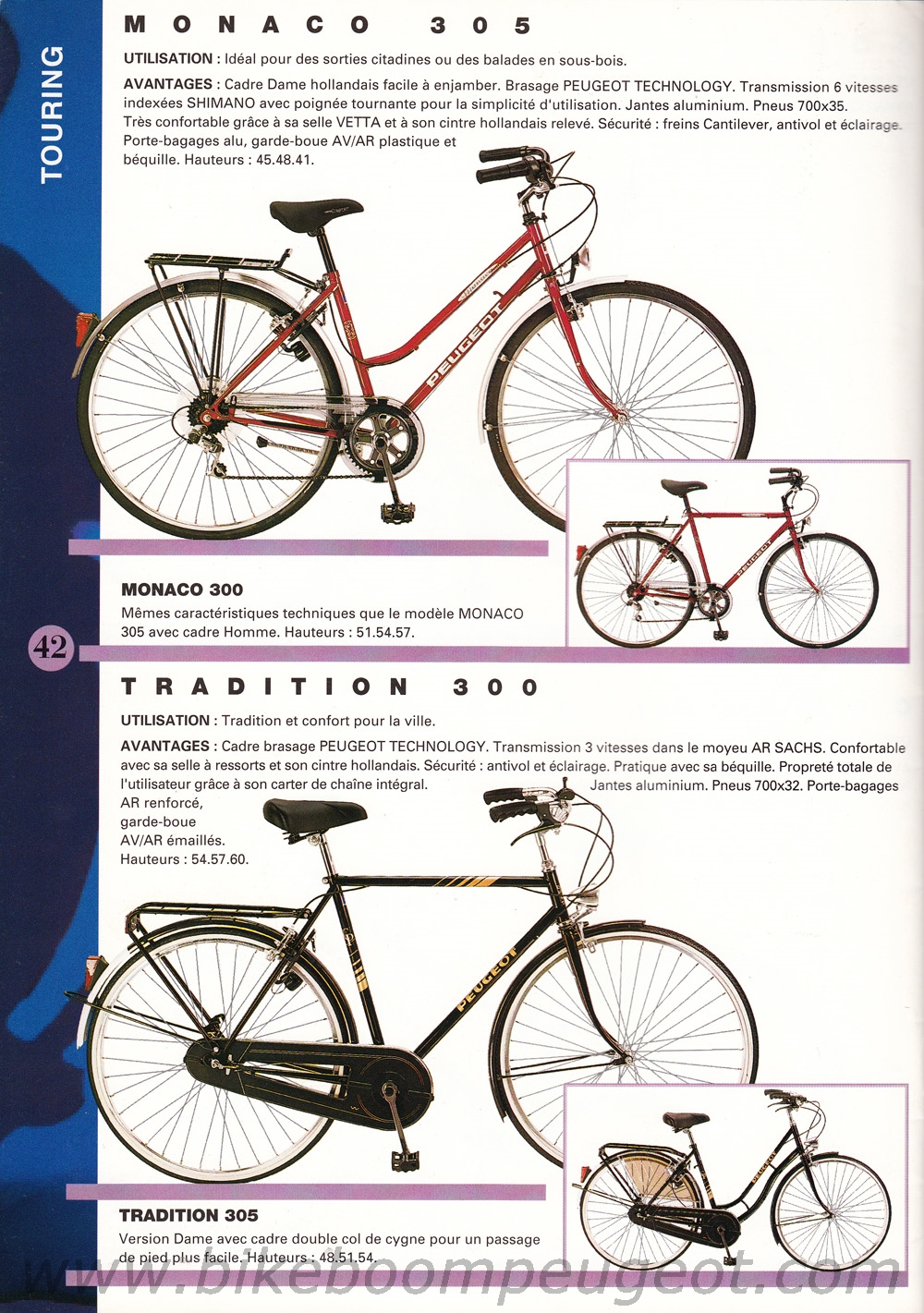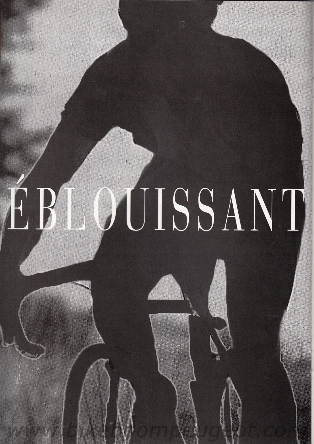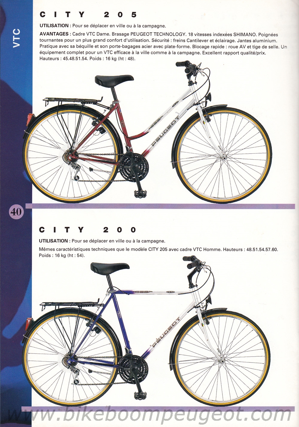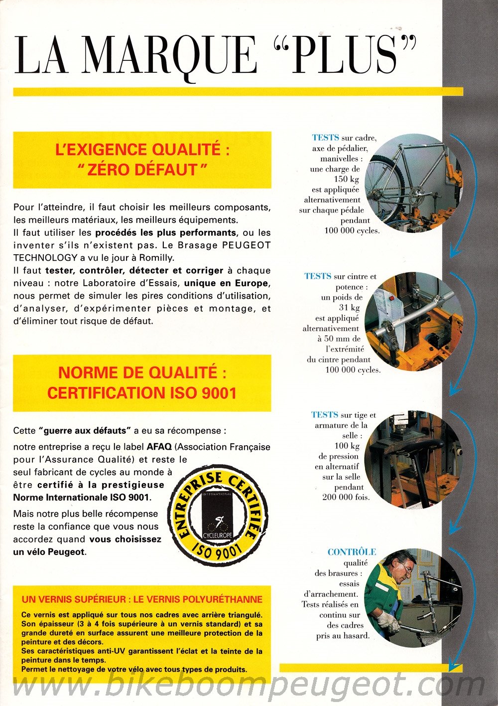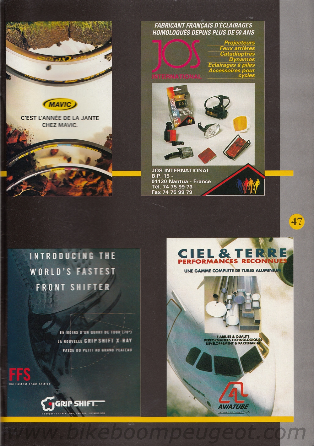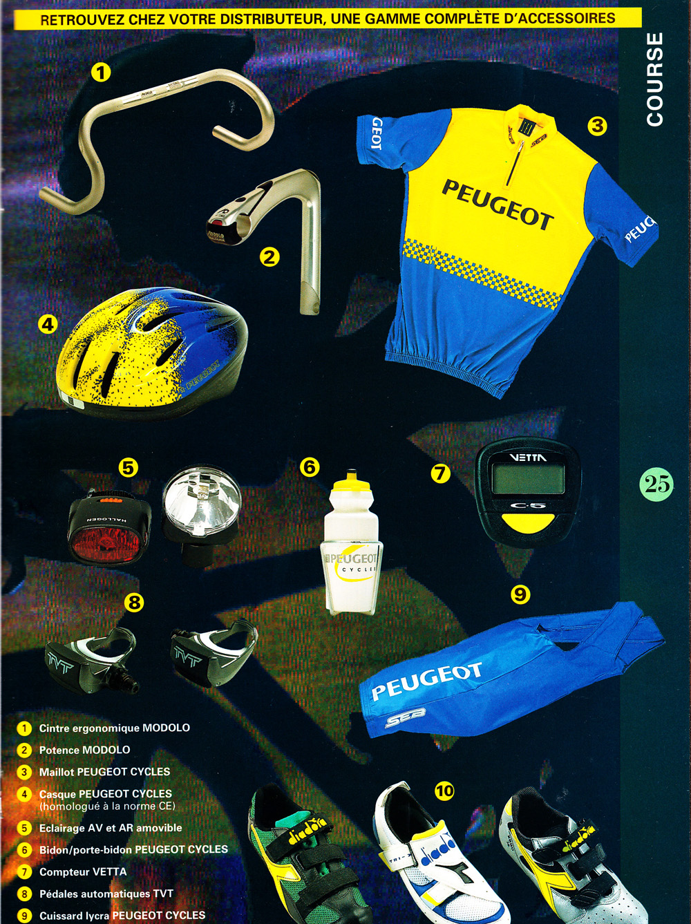 This brochure written in French was published in 1996, based on the text in the publication (e.g., "La collection VTT Peugeot 96."), by the CycleEurope Groupe and includes the full line of non-performance Peugeot bicycles. The CycleEurope Groupe also published in 1996 a Team Line brochure only covering Peugeot's a la carte performance bicycles.