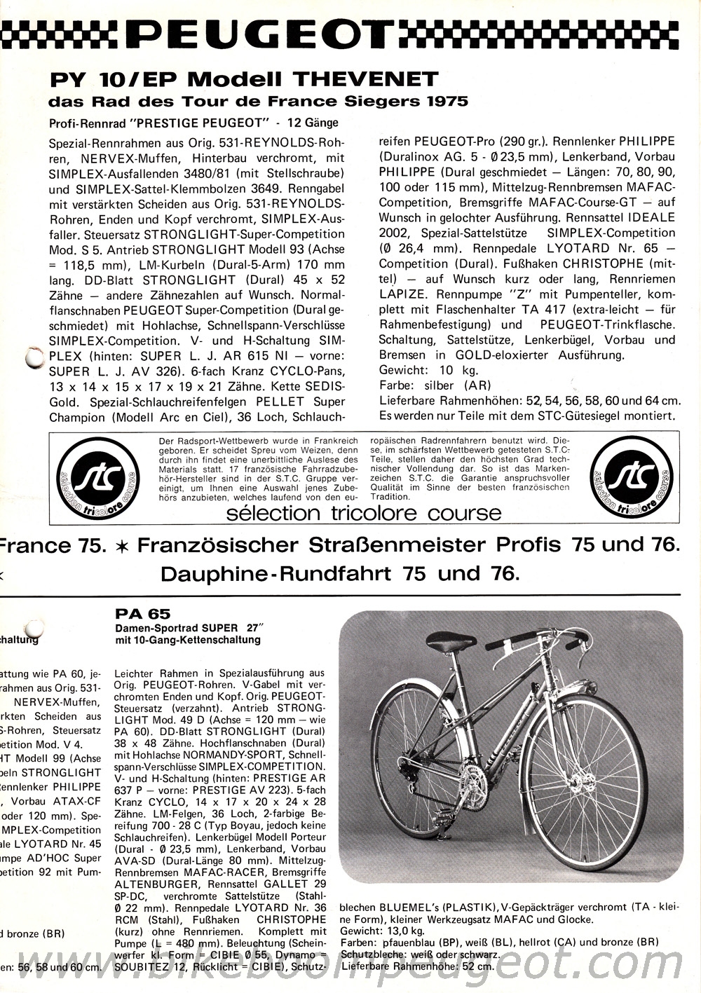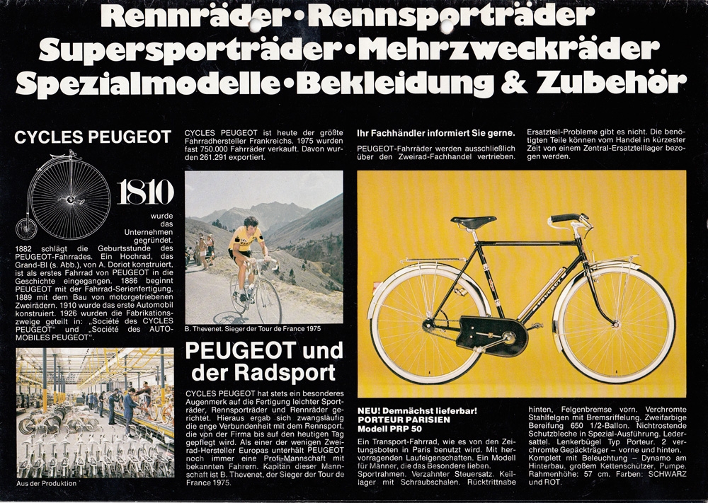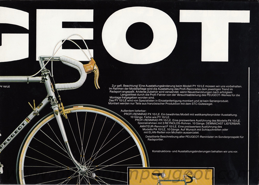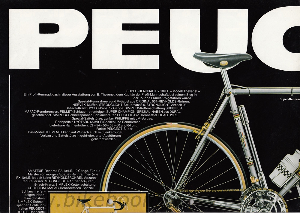 This undated flyer is believed to be of 1976 vintage. It notes Bernard Thevenet's 1975 Tour de France win on the PY/10LE, and the front photo is the same as in the brochure above.