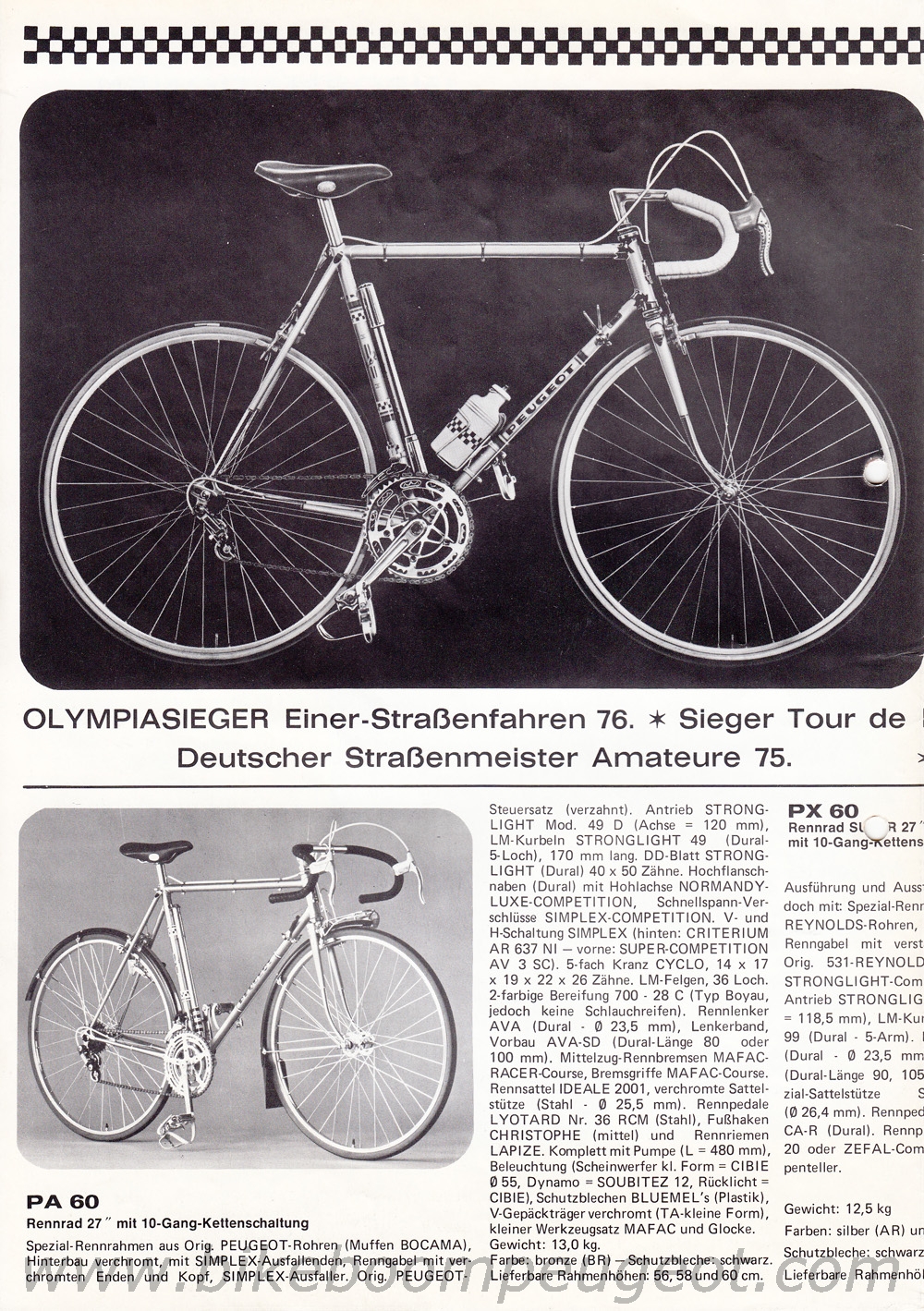 This is a flyer describes the top models from the 1976 Peugeot bicycle pogram, and it notes the PY10/LE's 1975 and 1976 bicycle race wins, as in the brochure/poster above.