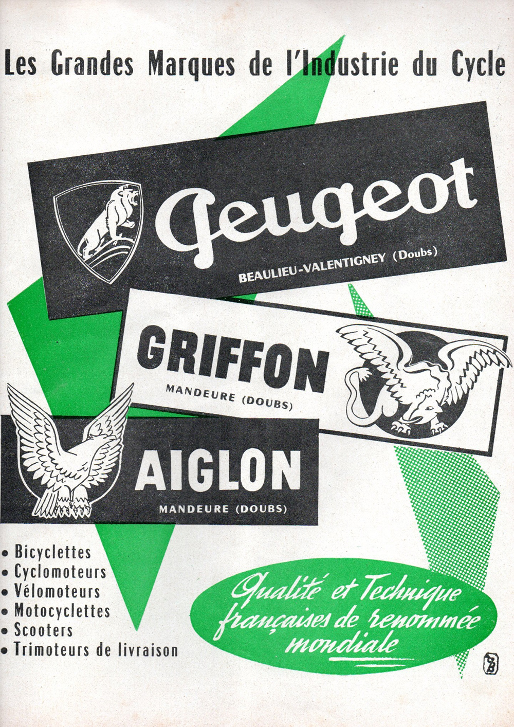 Below is an ad published in a special May 1957 issue of Officiel du Cycle et Motocycle linking Aiglon, Griffon, and Peugeot; and posted on the Tontonvelo website by KRISSTOFF (2023).