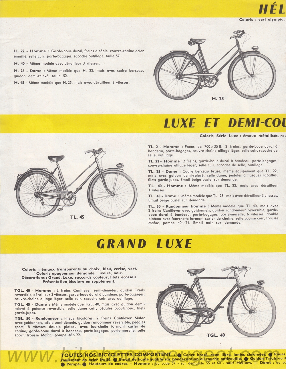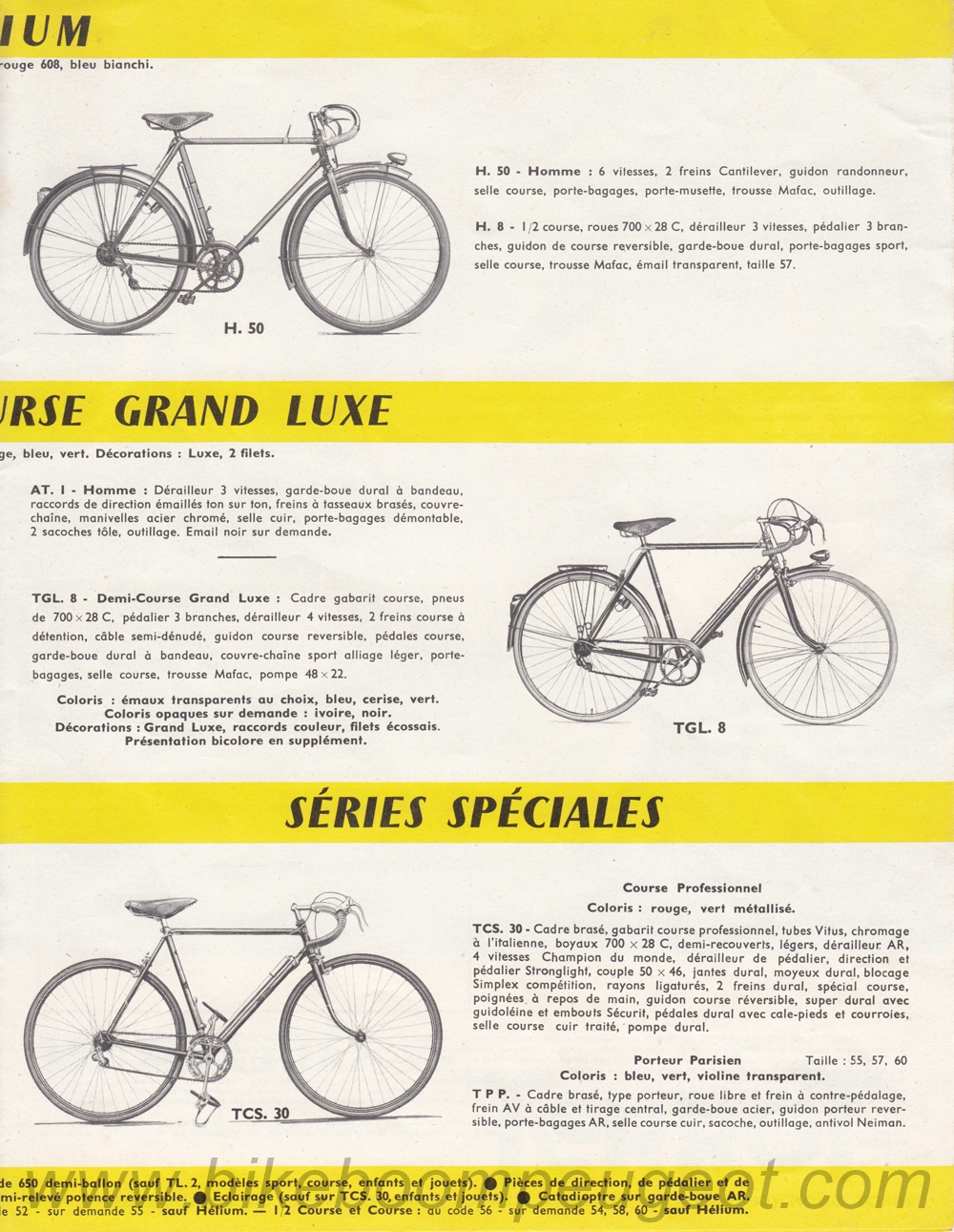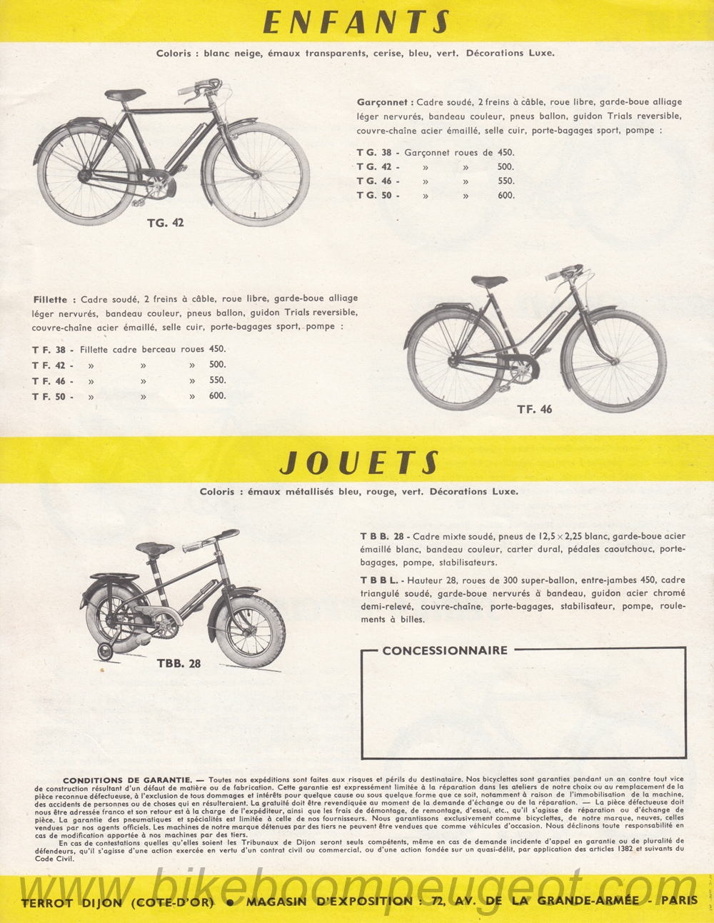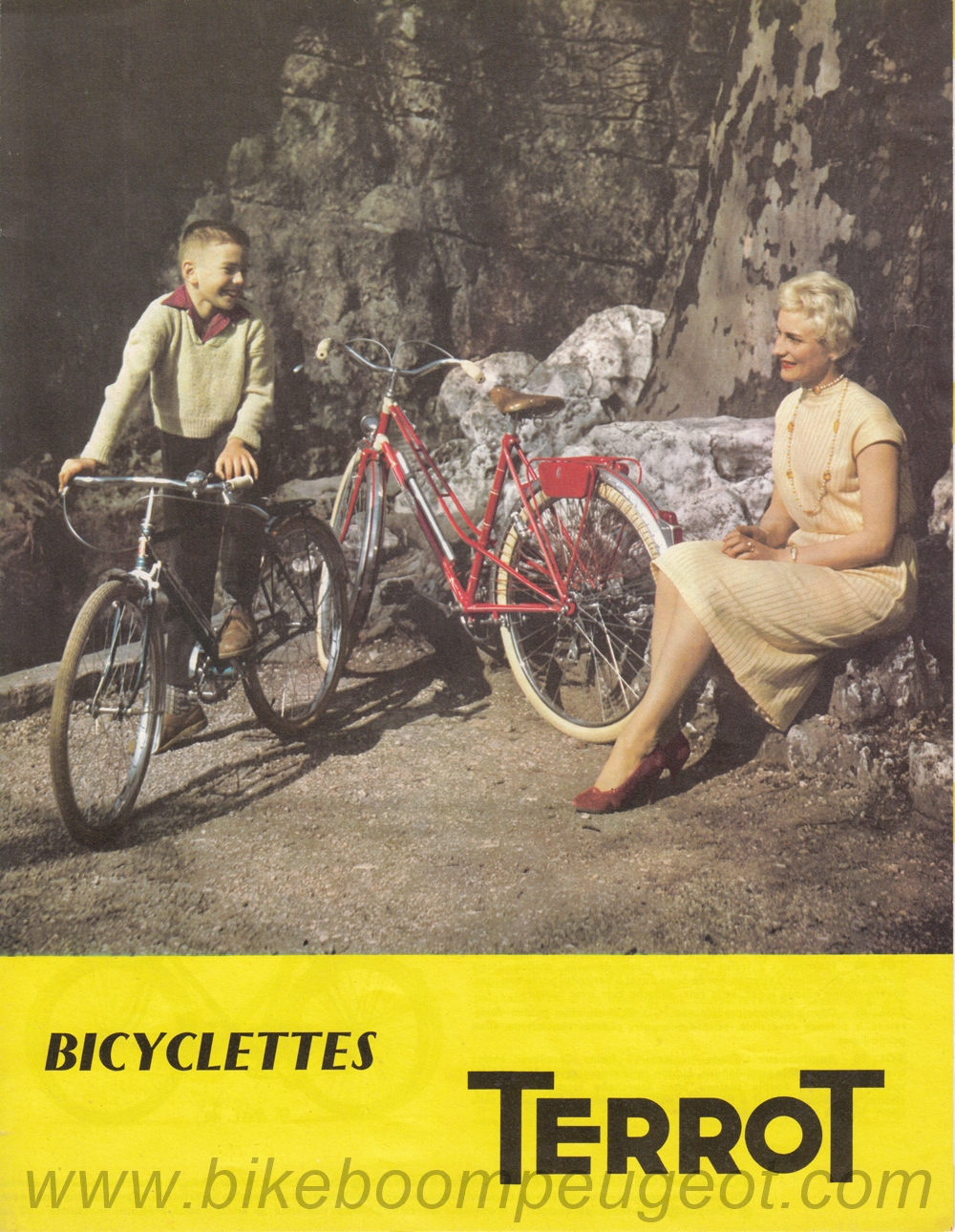 This brochure was dated by comparing model ranges in the late 1950's and early 1960's Peugeot brochures posted on this website and Terrot brochures posted on the TERROT Club de France website. Also, the woman and child on the cover of this brochure are the same as on the Terrot 1958 brochure. It appears to be a transitional brochure between 1958 and 1960.