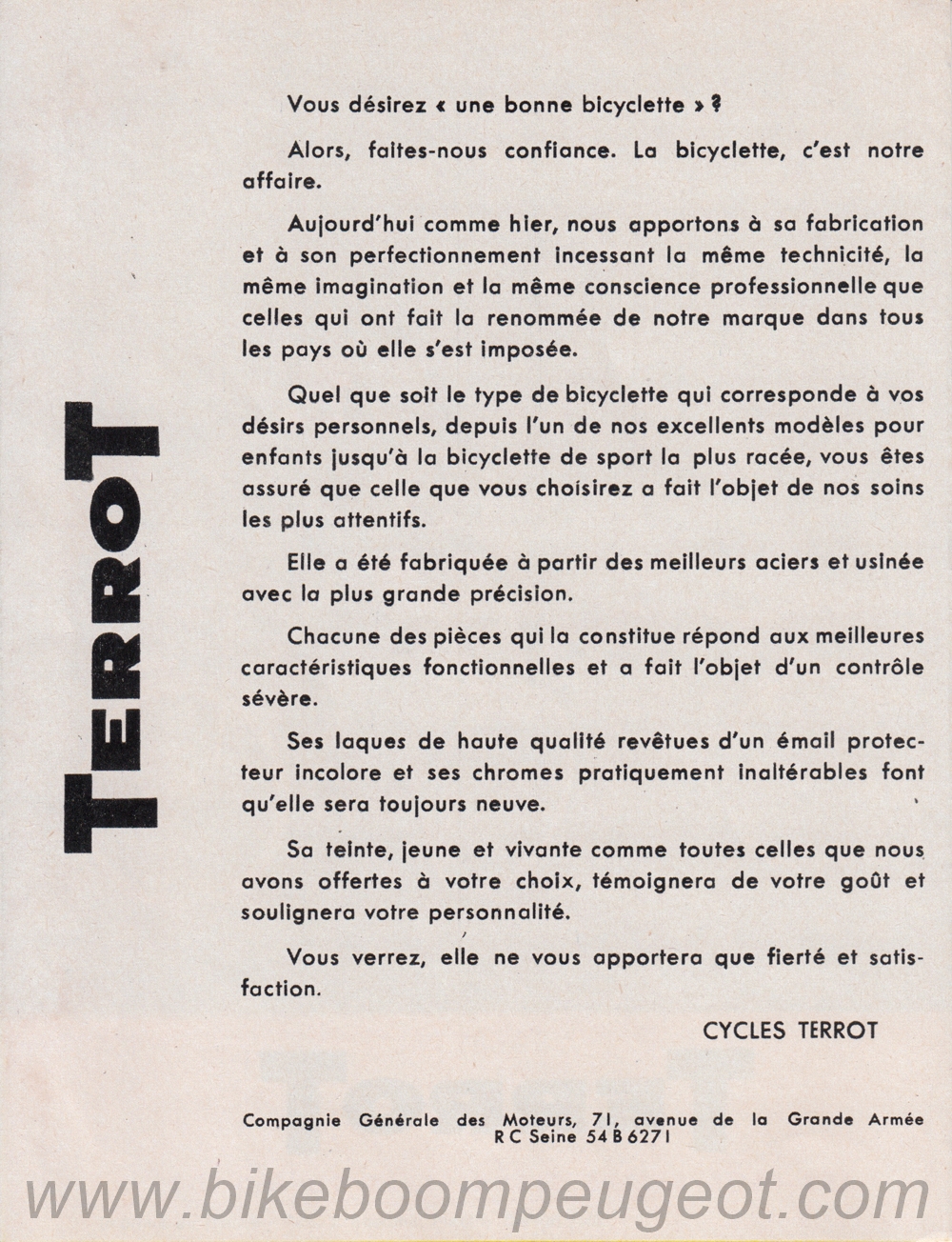 This brochure is the same as the Peugeot 1961 or 1962 brochure except for the Terrot front cover name and Introduction.
