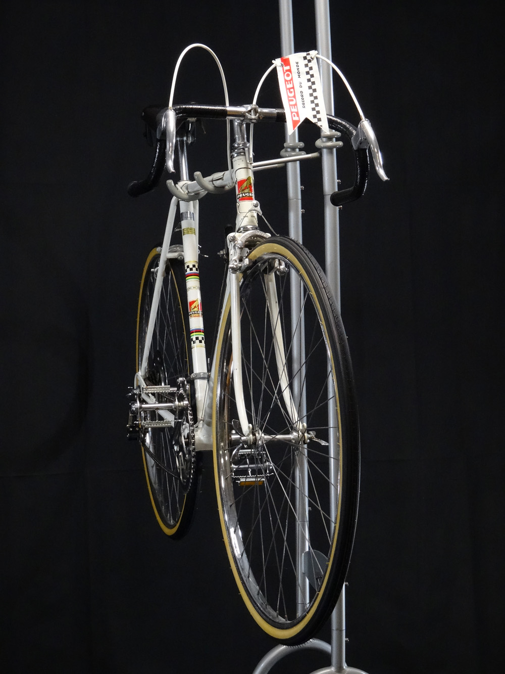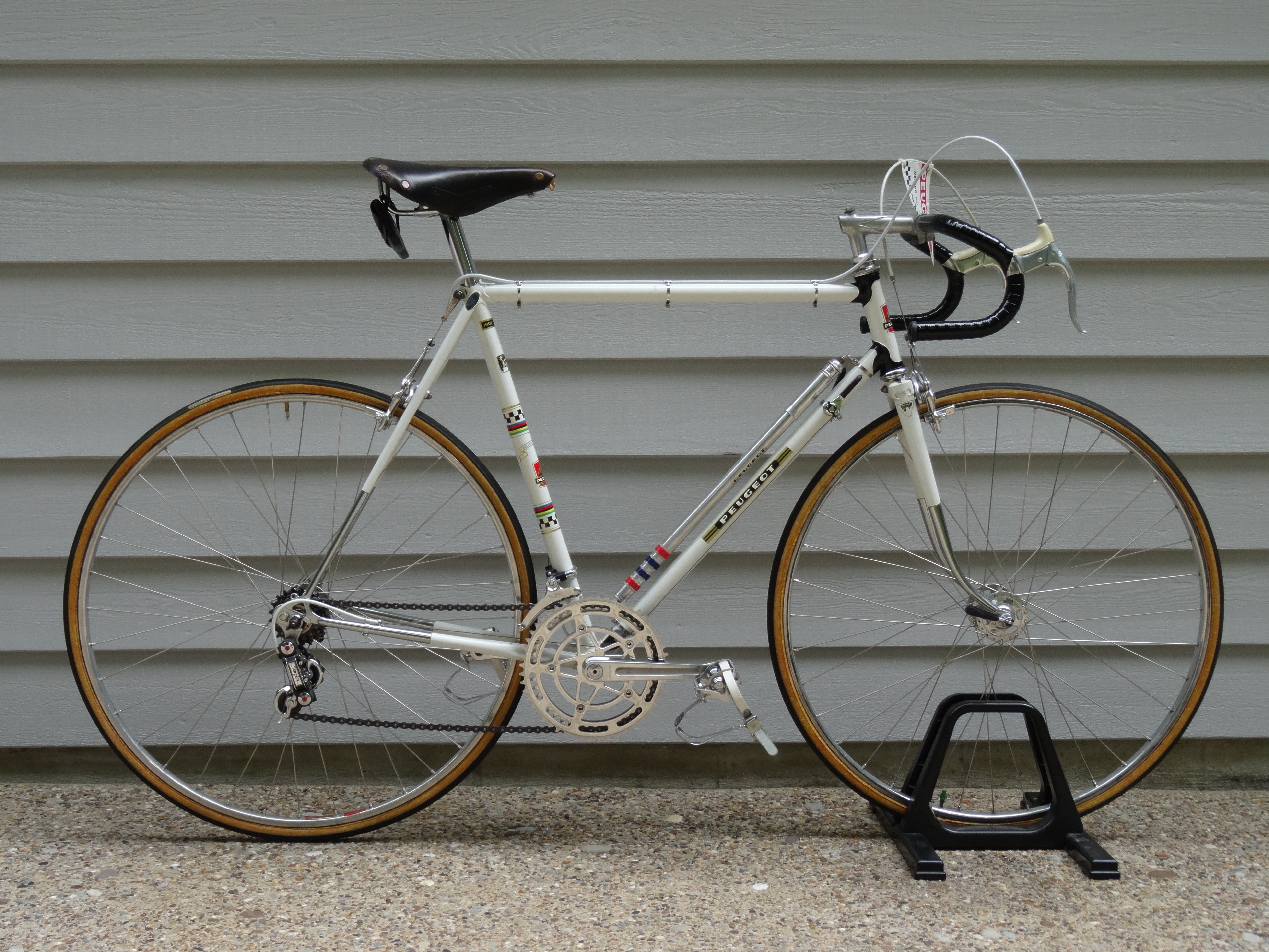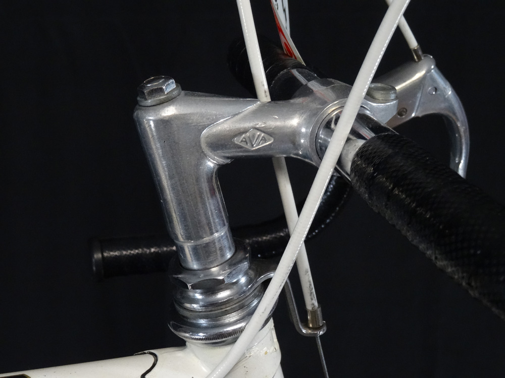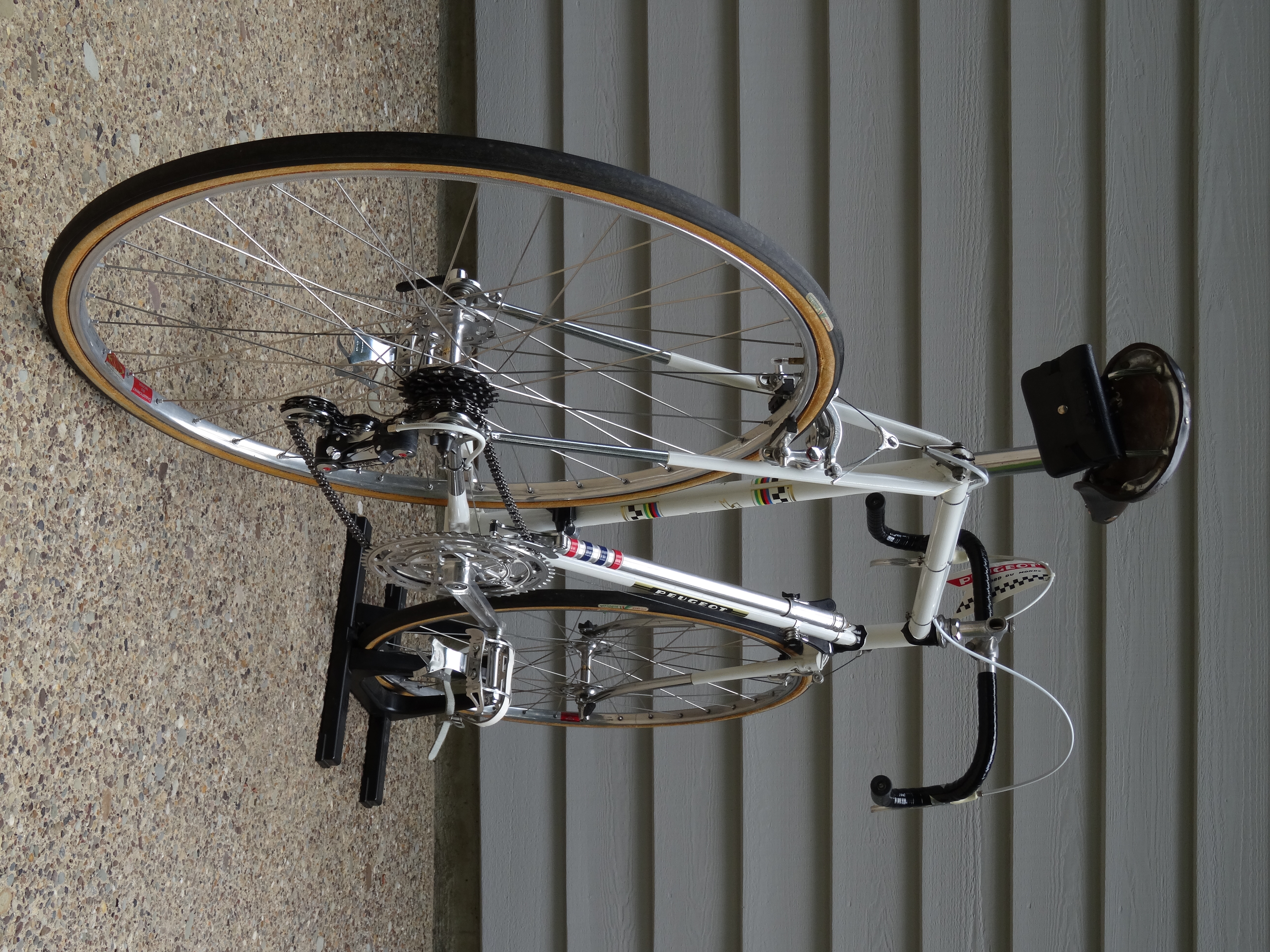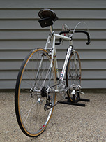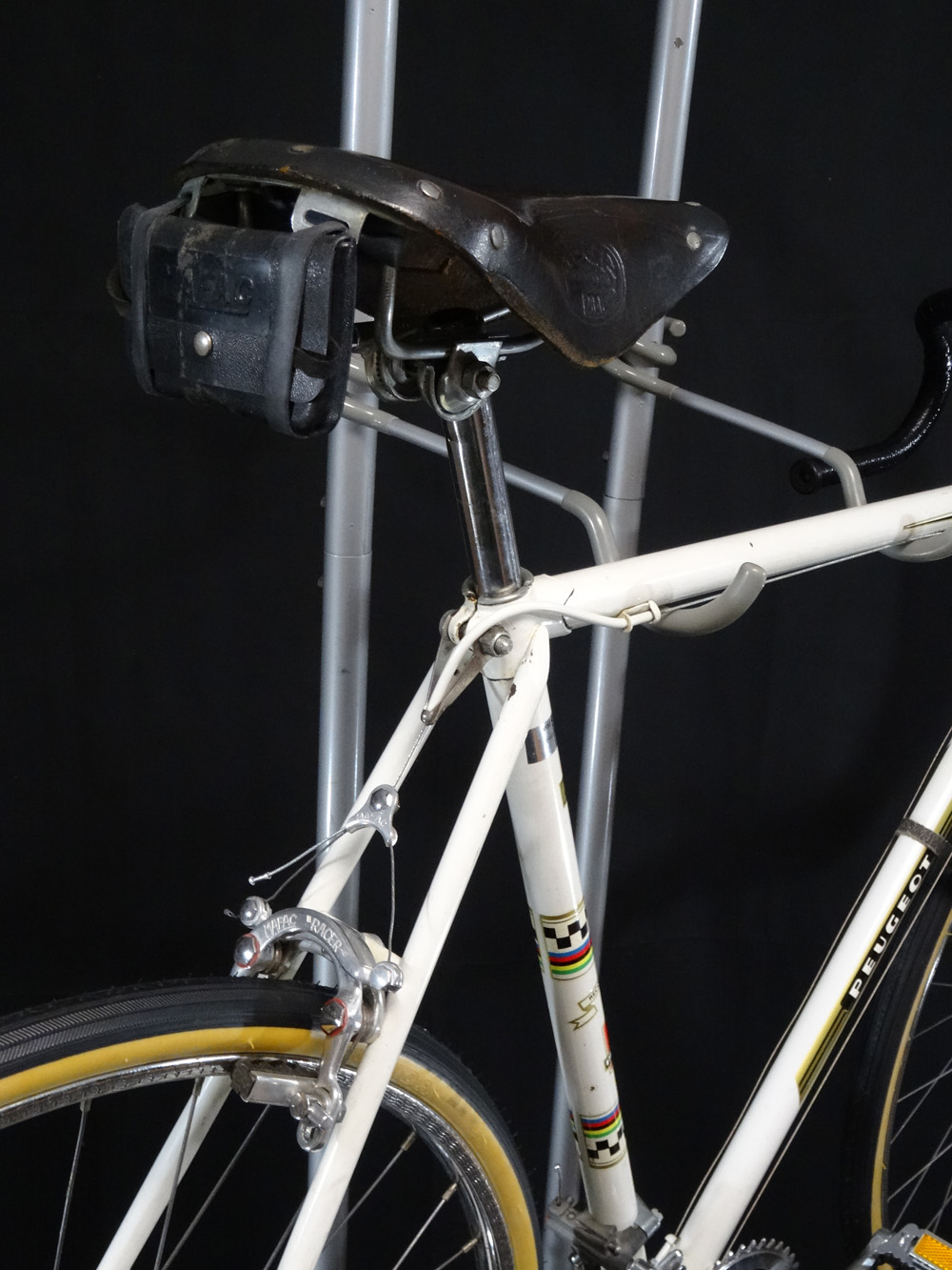 This bicycle inspired the BikeBoomPeugeot website. It was purchaed by my father in 1972 from Visentin's Bike & Mower in Oyster Bay, New York and occasionally ridden by me during my youth on Long Island. I have been told that white AO8's were not common. The bicycle spent much of its life hanging from our garage ceiling and is therefore mostly original and in great condition. The original pedals were missing so they were replaced with NOS, along with the cables and housings, and tires. The bicycle came factory-equipped with a non-standard DEA Super Chrome front rim. The headtube, bottom bracket, and hubs were rebuilt with Sunlite ball bearings and Phil Wood grease.