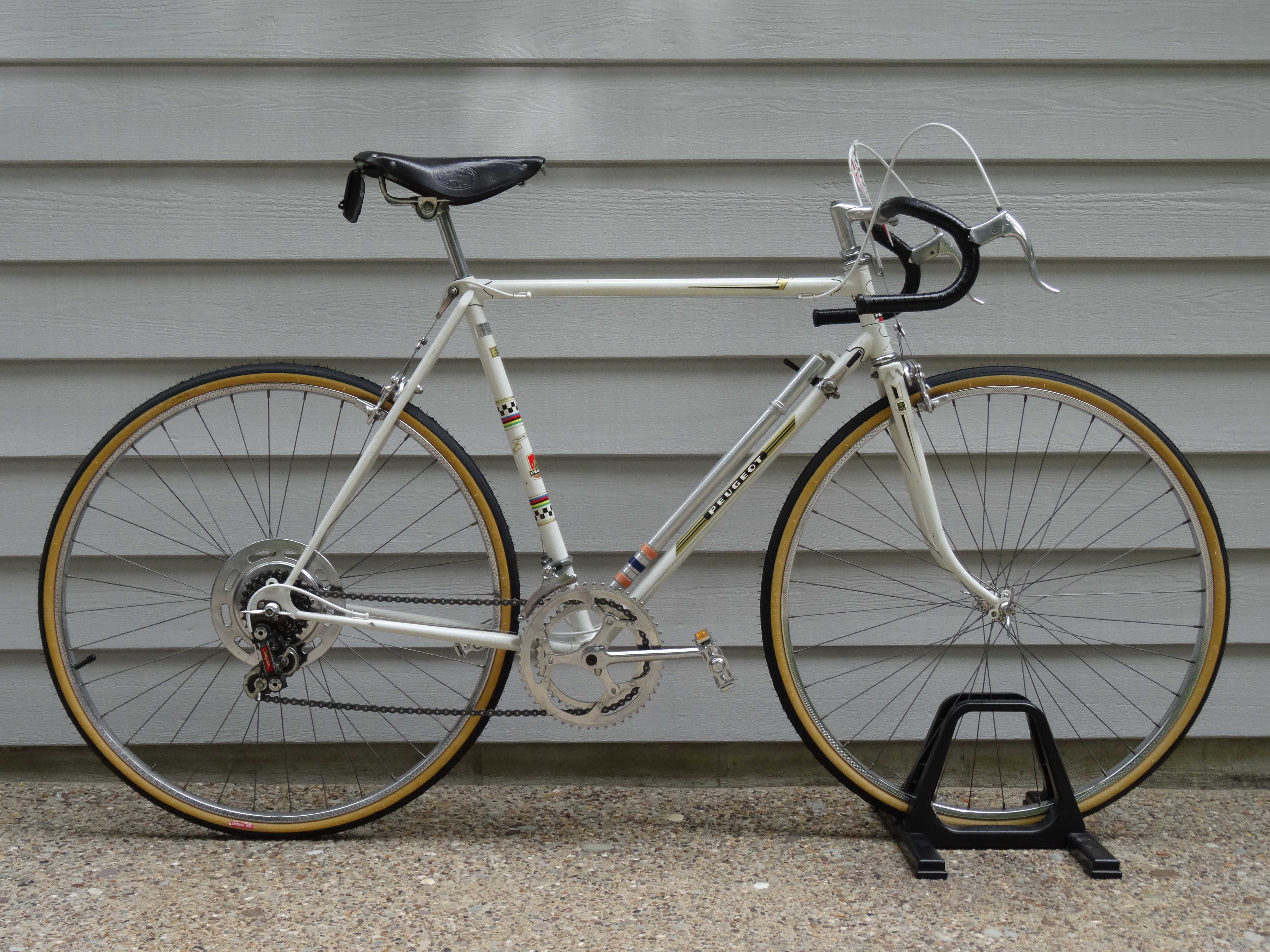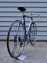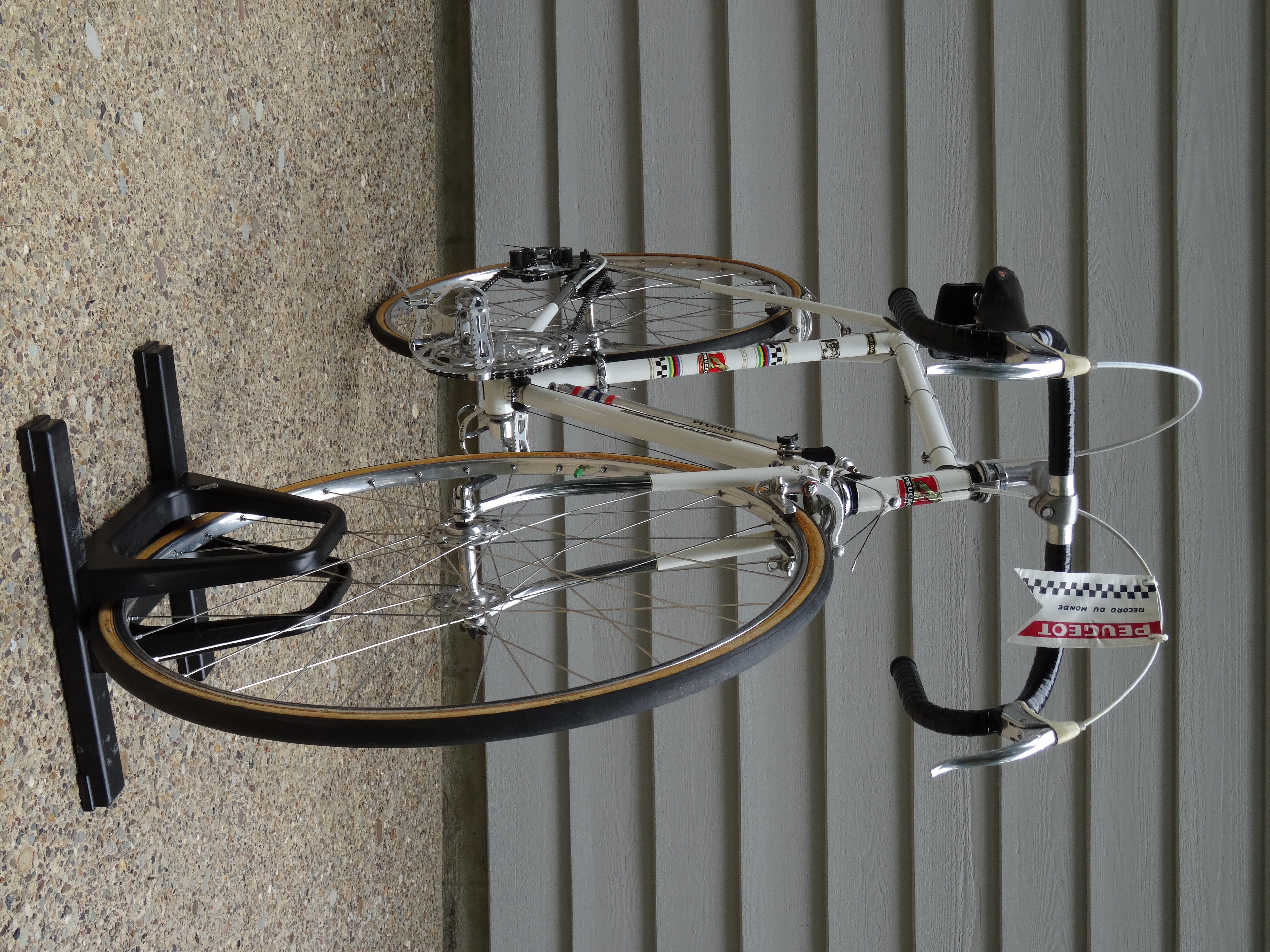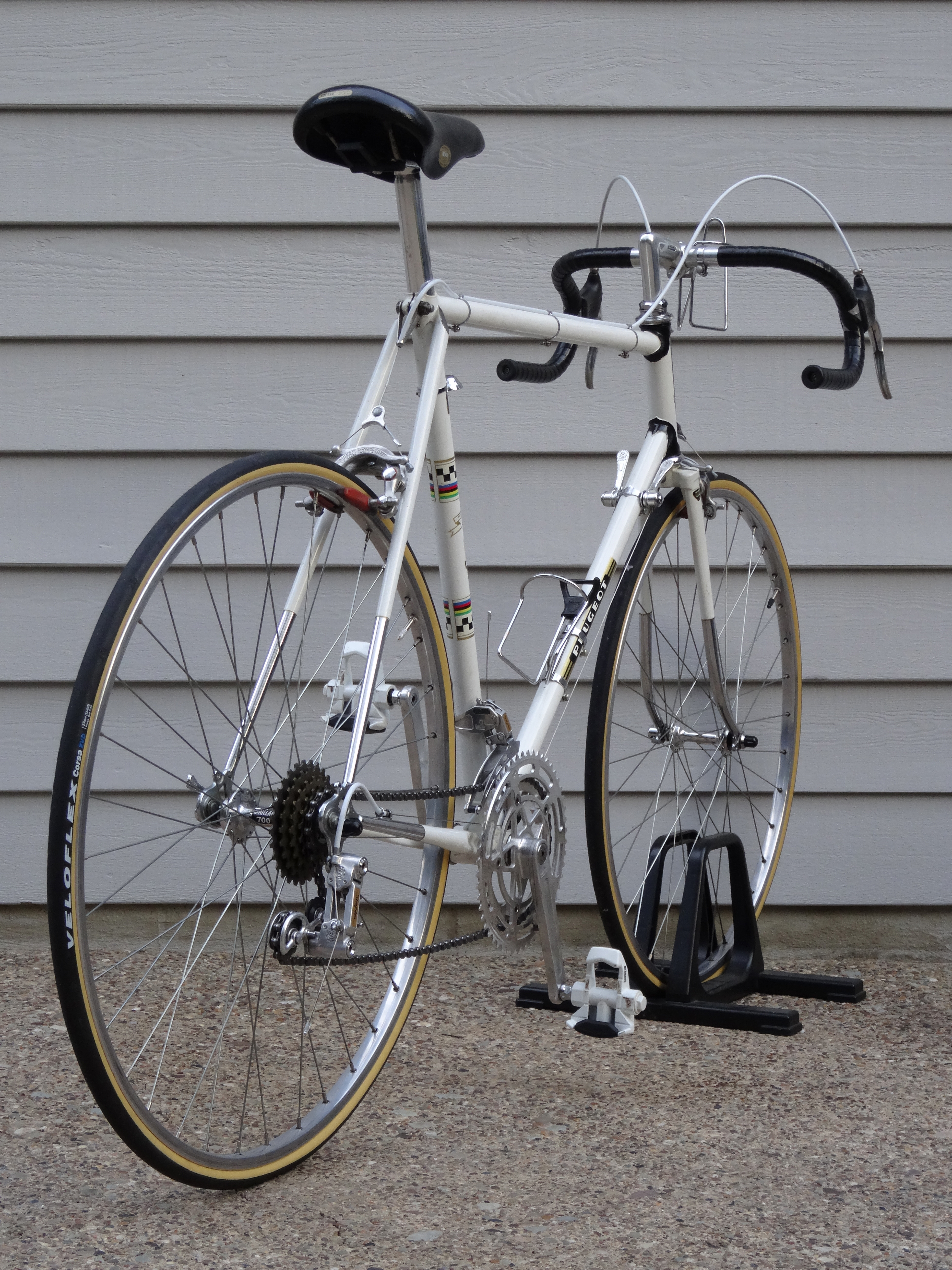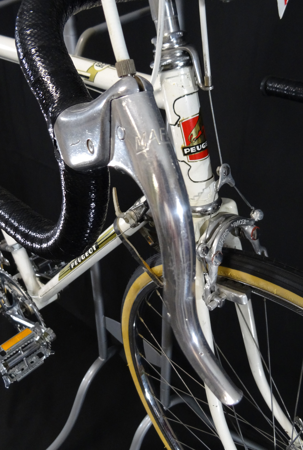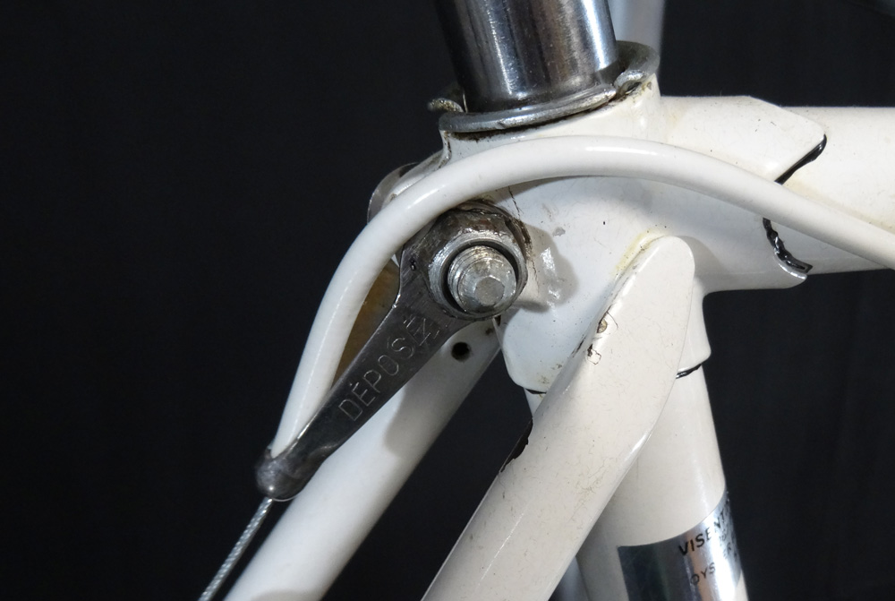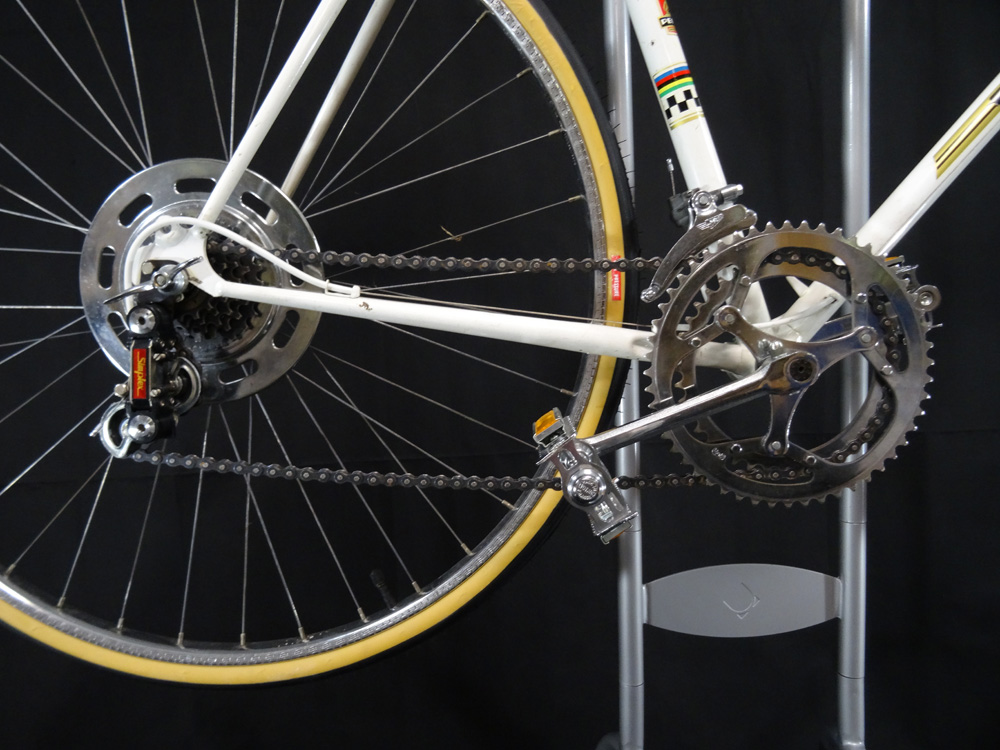 This bicycle inspired the BikeBoomPeugeot website. It was purchaed by my father in 1972 from Visentin's Bike & Mower in Oyster Bay, New York and occasionally ridden by me during my youth on Long Island. I have been told that white AO8's were not common. The bicycle spent much of its life hanging from our garage ceiling and is therefore mostly original and in great condition. The original pedals were missing so they were replaced with NOS, along with the cables and housings, and tires. The bicycle came factory-equipped with a non-standard DEA Super Chrome front rim. The headtube, bottom bracket, and hubs were rebuilt with Sunlite ball bearings and Phil Wood grease.