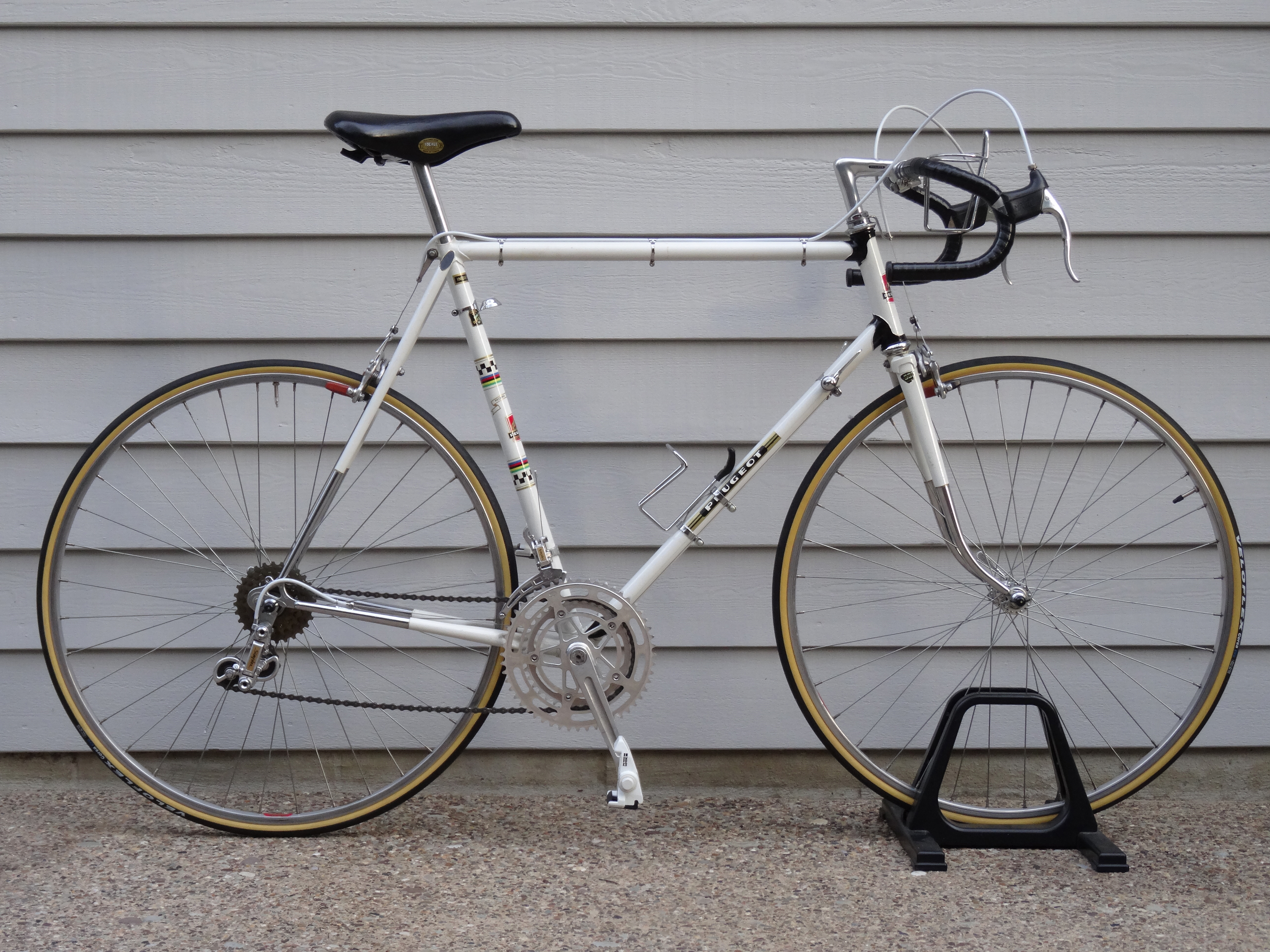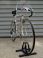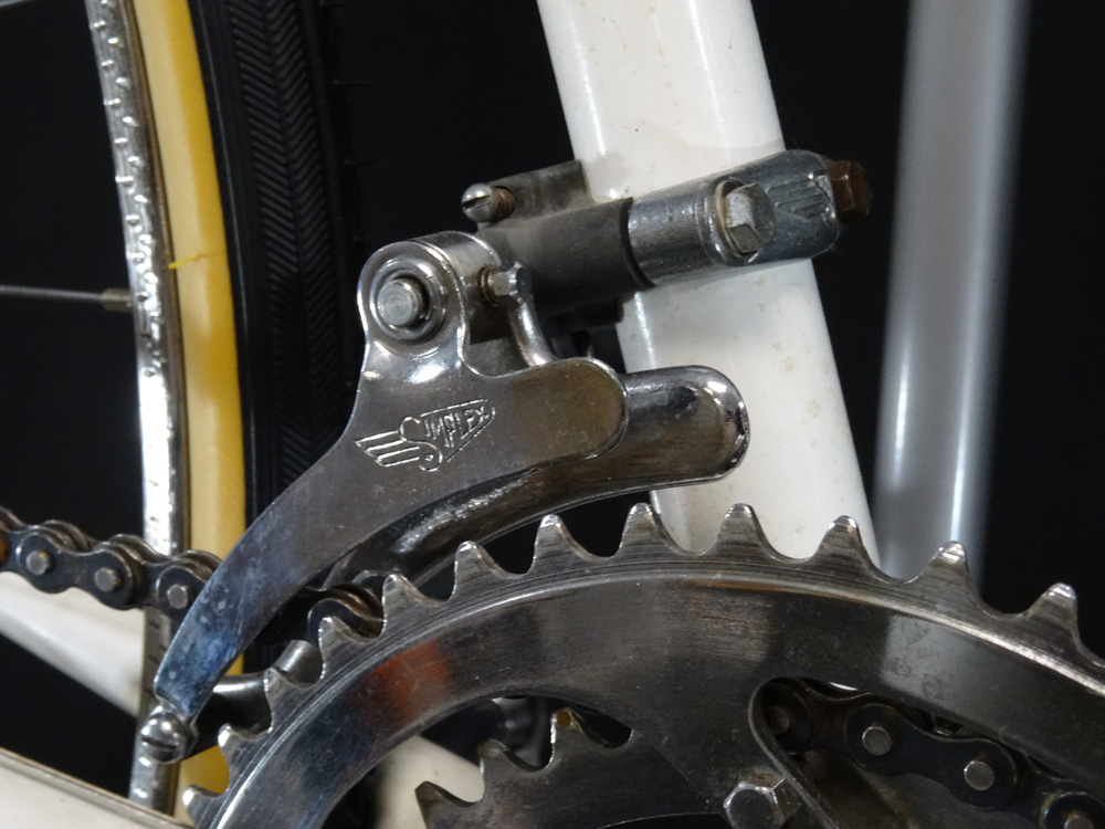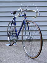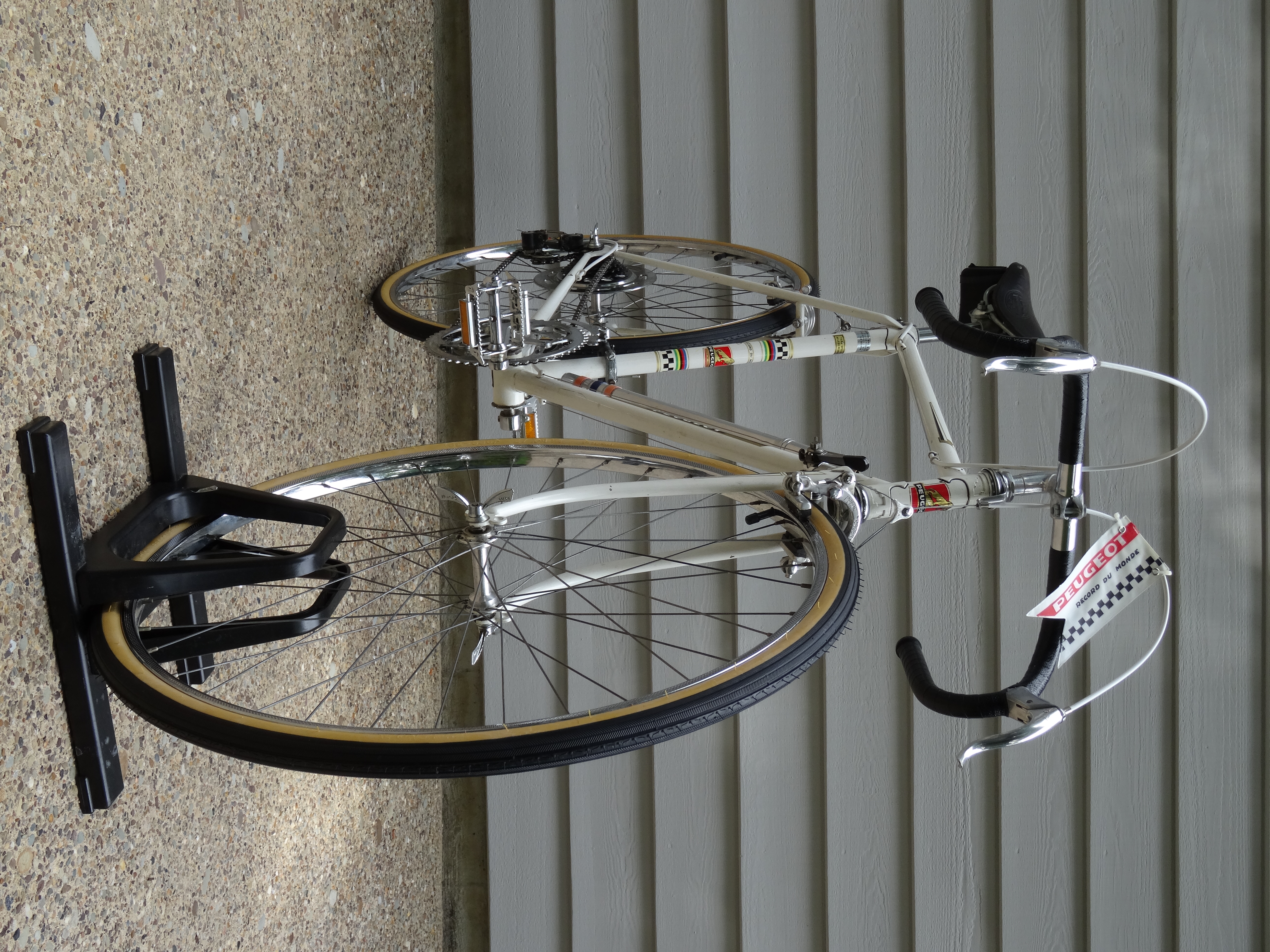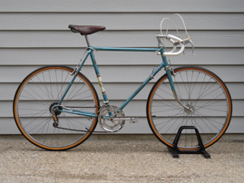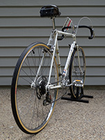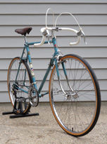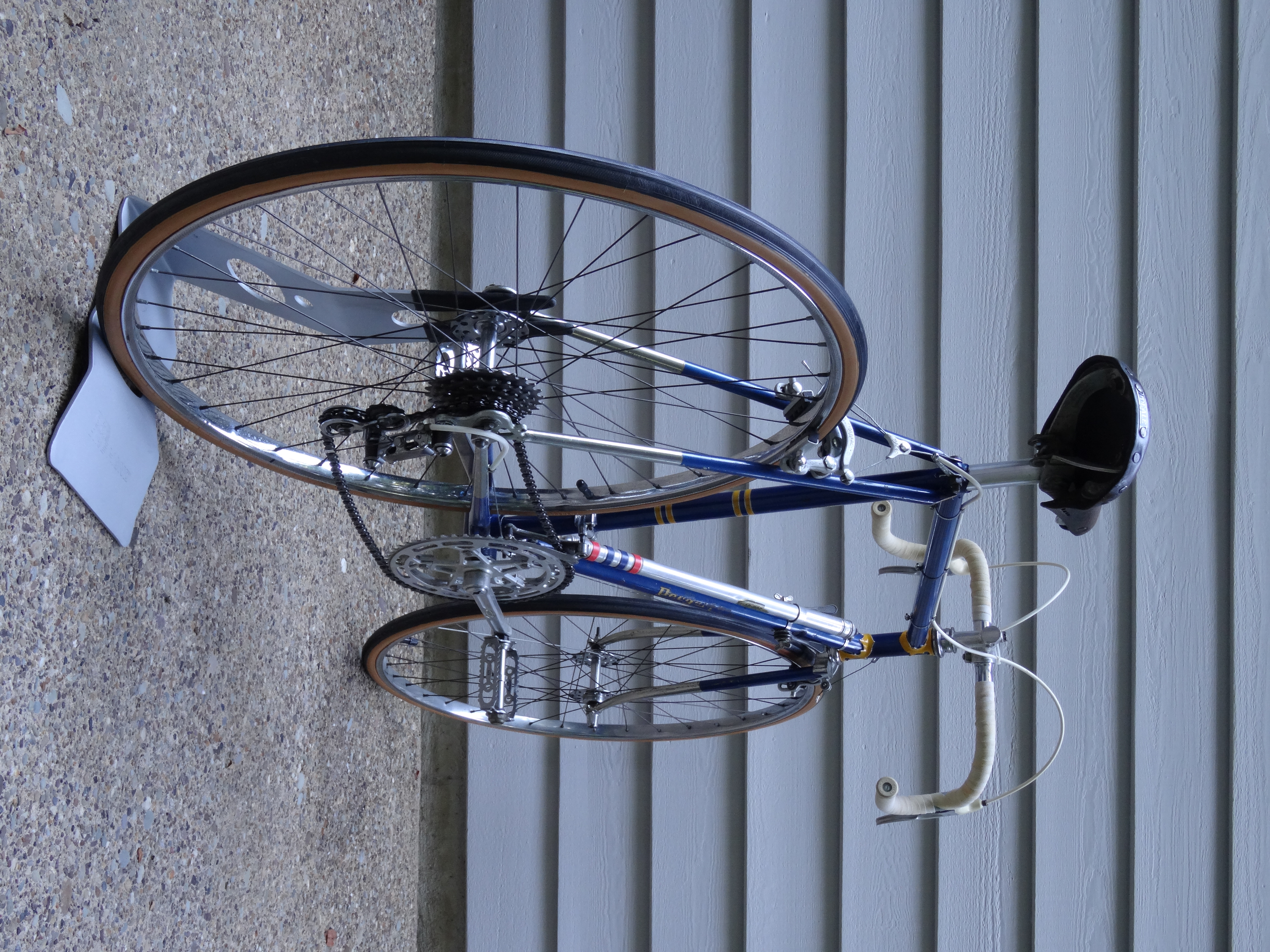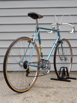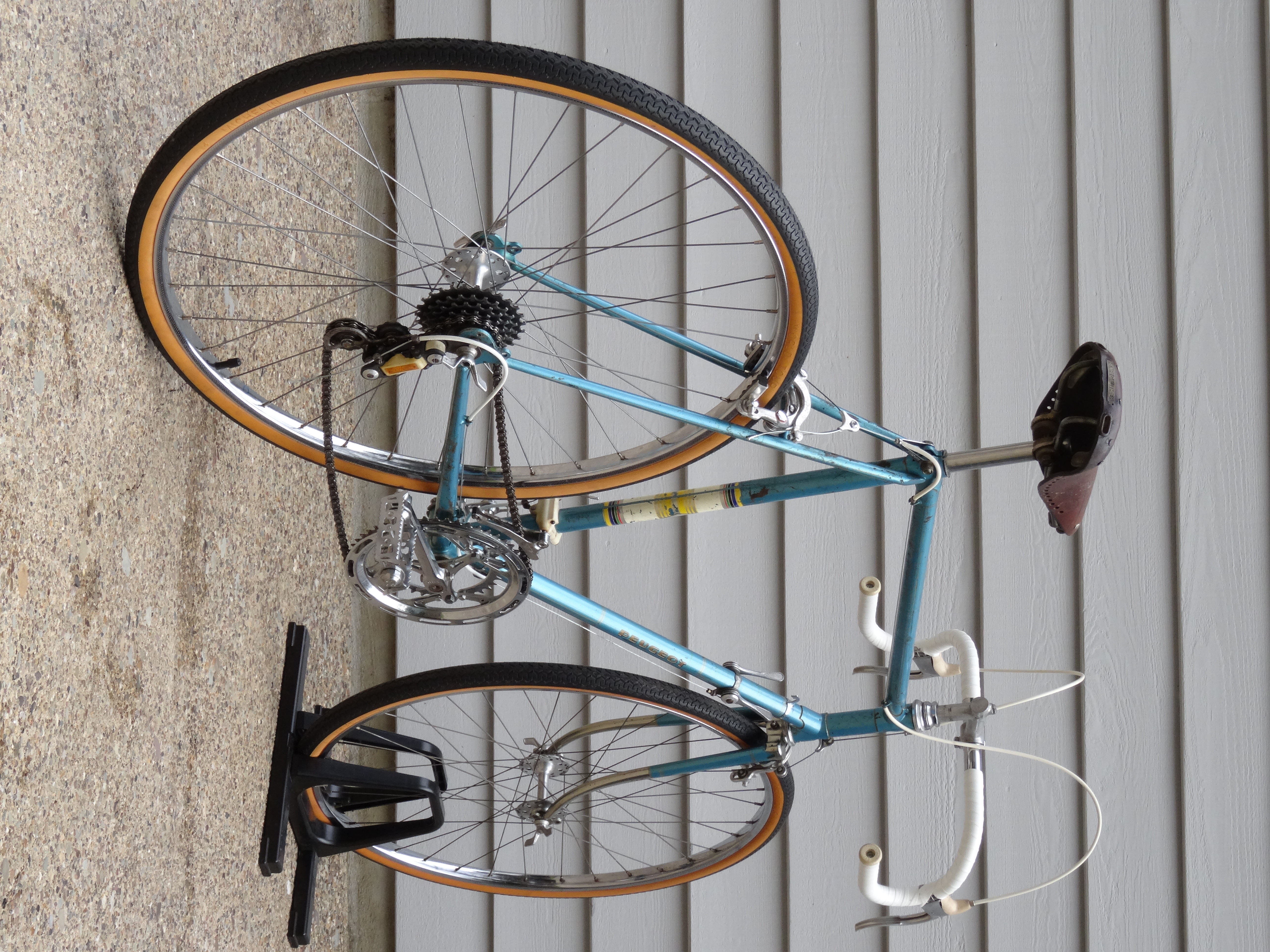 This bicycle inspired the BikeBoomPeugeot website. It was purchaed by my father in 1972 from Visentin's Bike & Mower in Oyster Bay, New York and occasionally ridden by me during my youth on Long Island. I have been told that white AO8's were not common. The bicycle spent much of its life hanging from our garage ceiling and is therefore mostly original and in great condition. The original pedals were missing so they were replaced with NOS, along with the cables and housings, and tires. The bicycle came factory-equipped with a non-standard DEA Super Chrome front rim. The headtube, bottom bracket, and hubs were rebuilt with Sunlite ball bearings and Phil Wood grease.