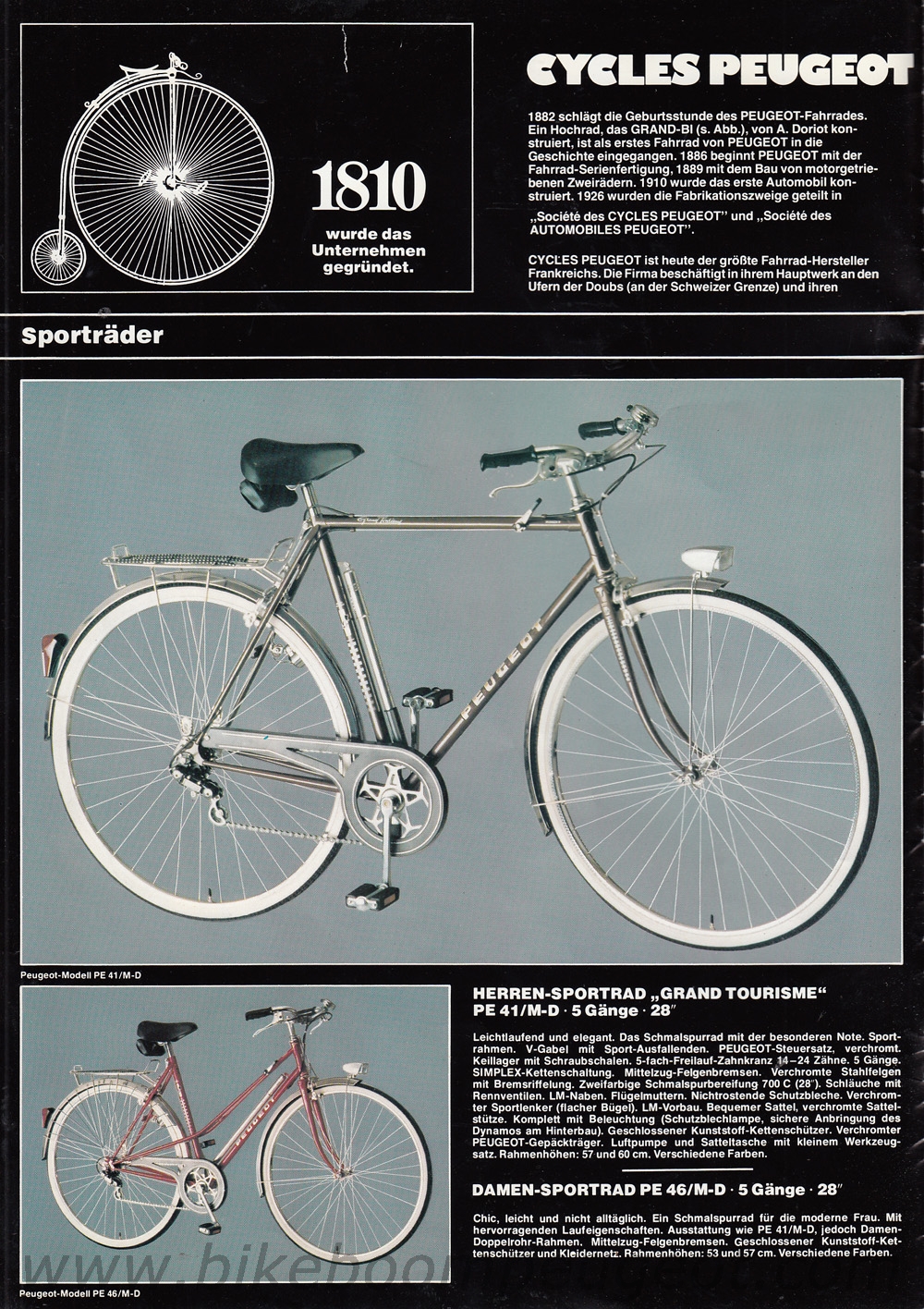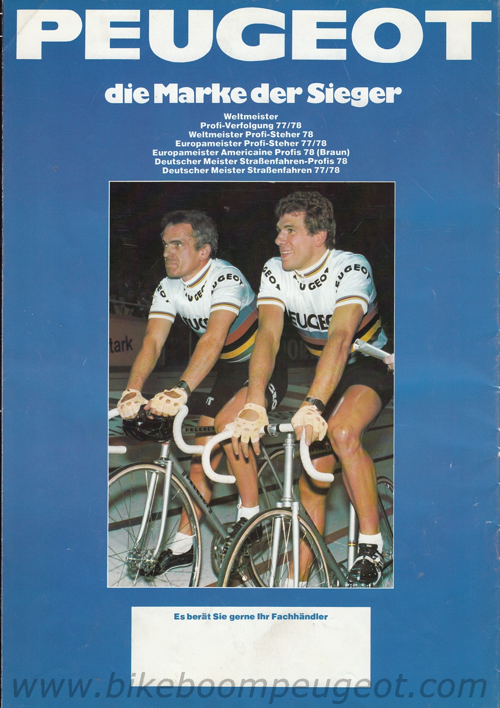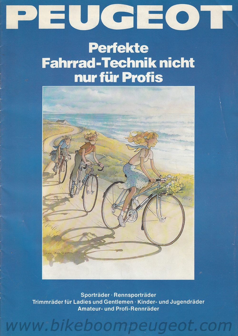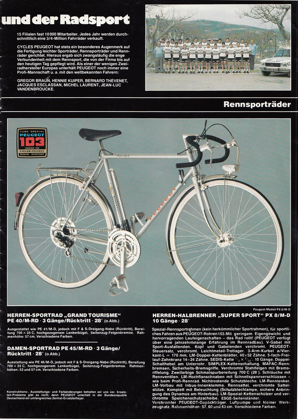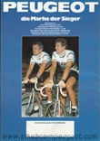 This undated brochure is believed to be of 1979 vintage. The dating is based on the cover cartoon that is similar to the 1979 French and 1980 Dutch brochures, the 1977 and 1978 Team Peugeot accolades, and the Prestige model decal designs and components that are more similar to the 1978 than 1980 brochure.