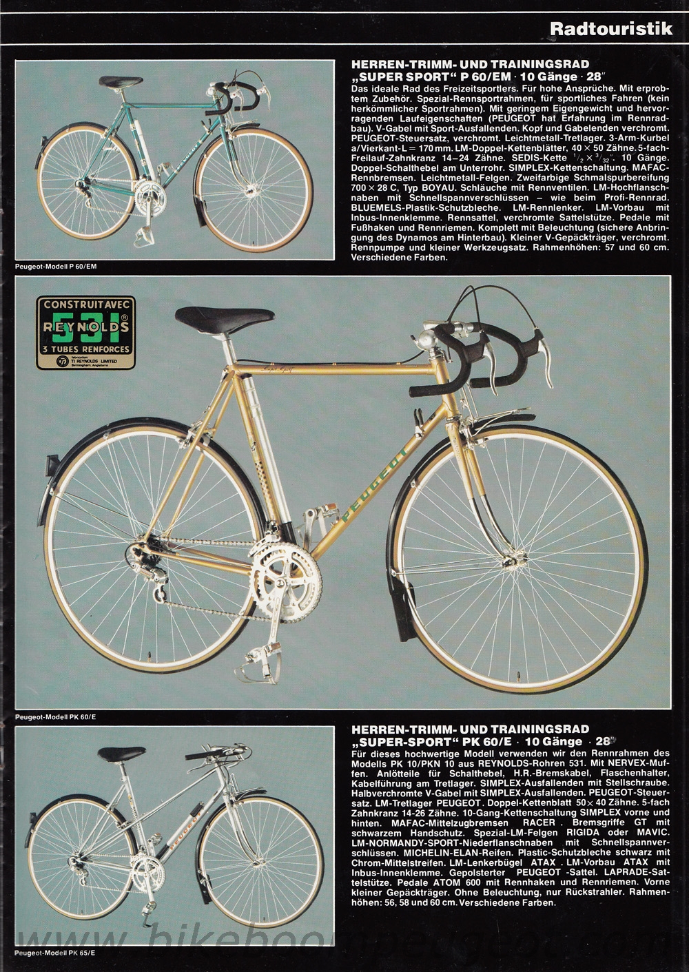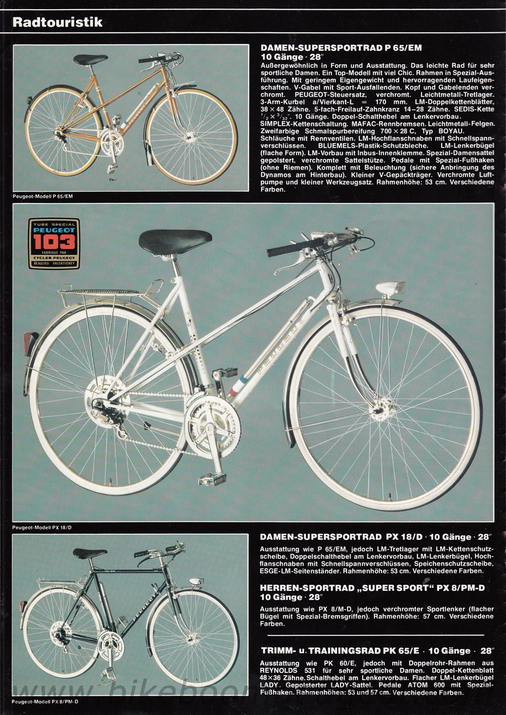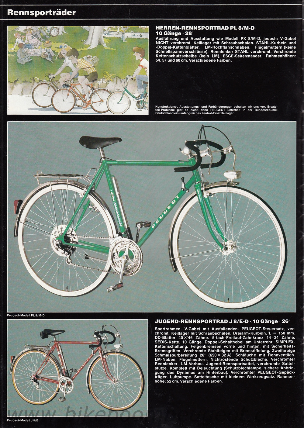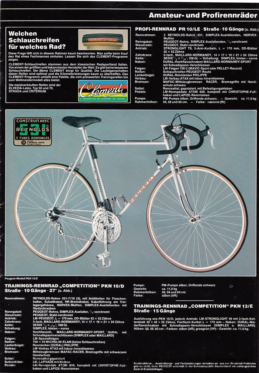 This undated brochure is believed to be of 1979 vintage. The dating is based on the cover cartoon that is similar to the 1979 French and 1980 Dutch brochures, the 1977 and 1978 Team Peugeot accolades, and the Prestige model decal designs and components that are more similar to the 1978 than 1980 brochure.