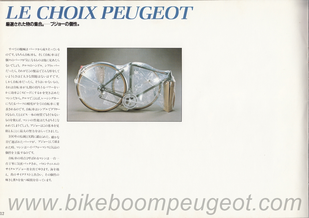 This dated Japanese brochure was distributed by Honda Motors in 1982, and represents Peugeot's 100 years anniversary. An English tranlsation of this brochure can be found on Satoshi Shoji's Cycles Peugeot Museum website.