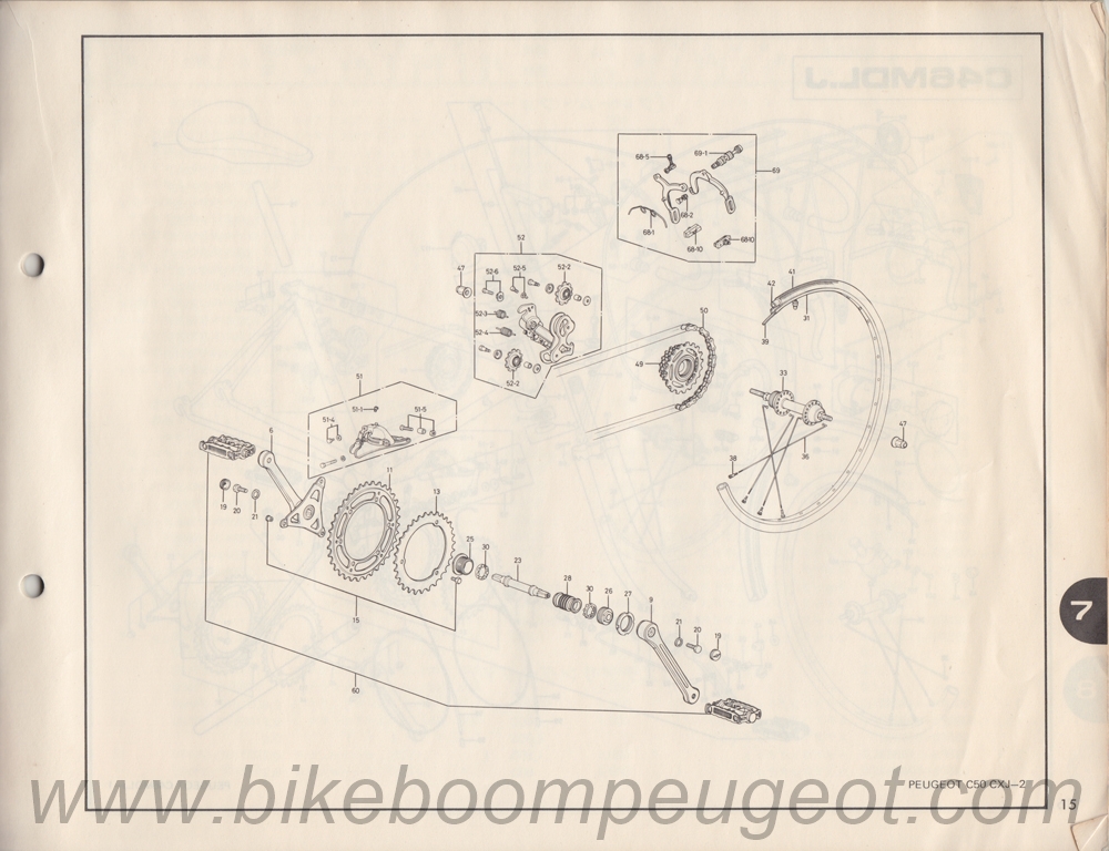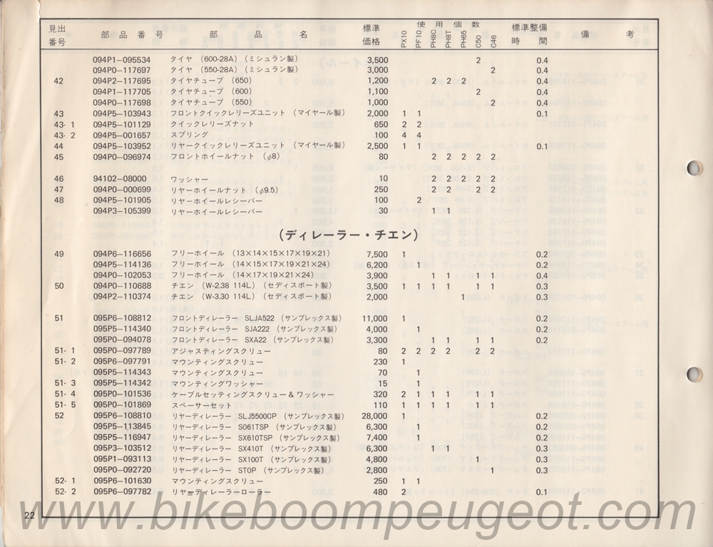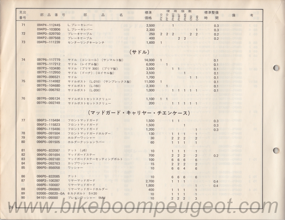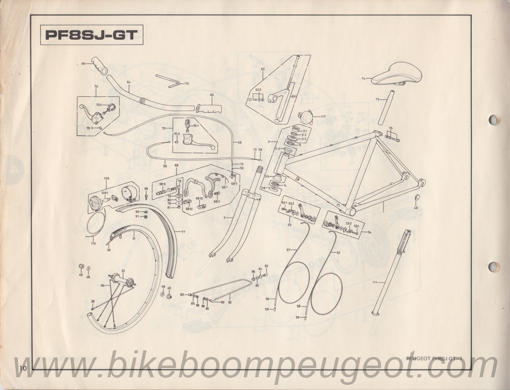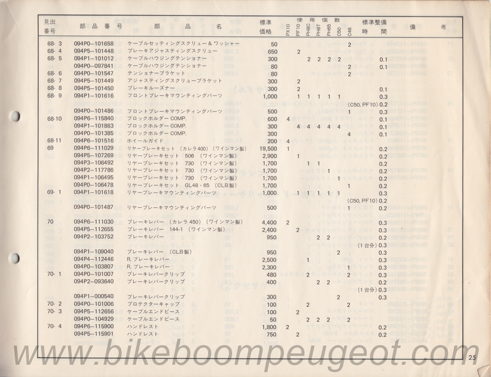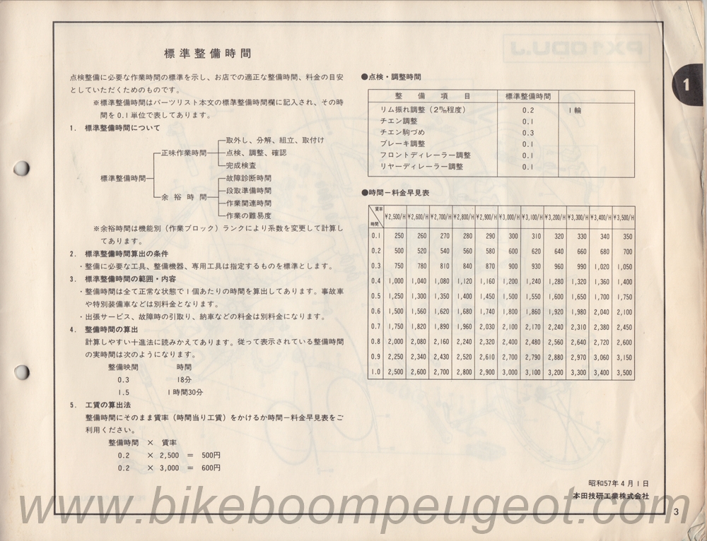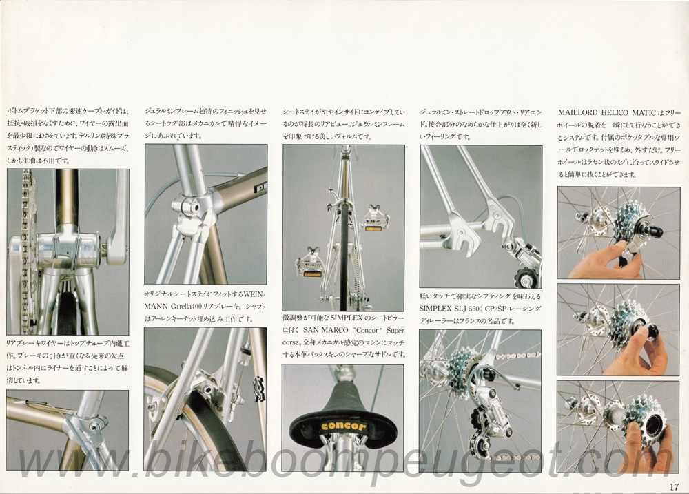 The bicycle models, components and equipment listed in this undated parts manual are identical to those listed in the dated Peugeot 1982 Japan brochure above.