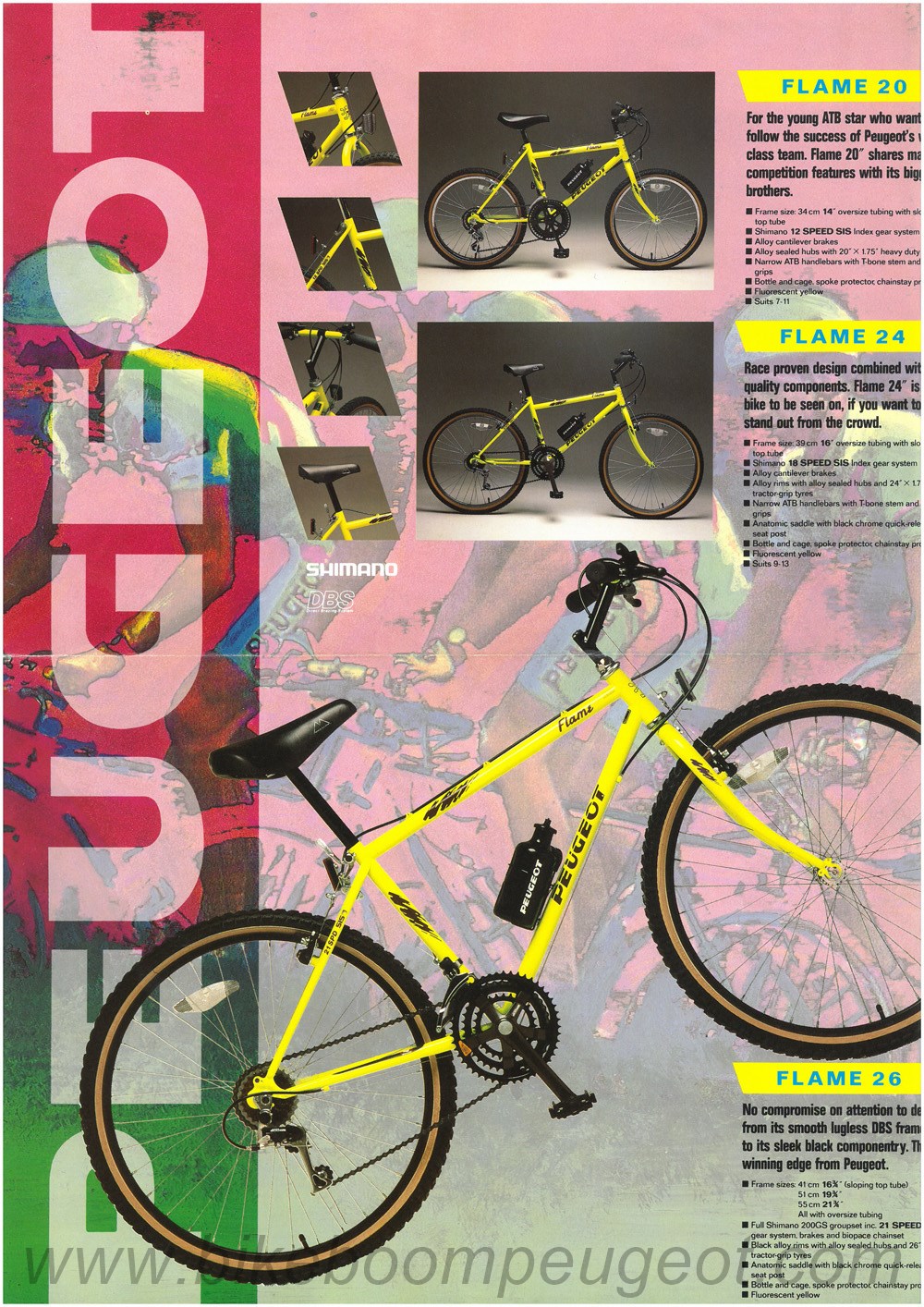 This undated Cycles Peugeot, UK (Ltd.) poster is believed to be of 1991 vintage based on the design of the bicycles ridden by the Peugeot ATB team. Compare with the undated Peugeot 1990 UK brochure poster.