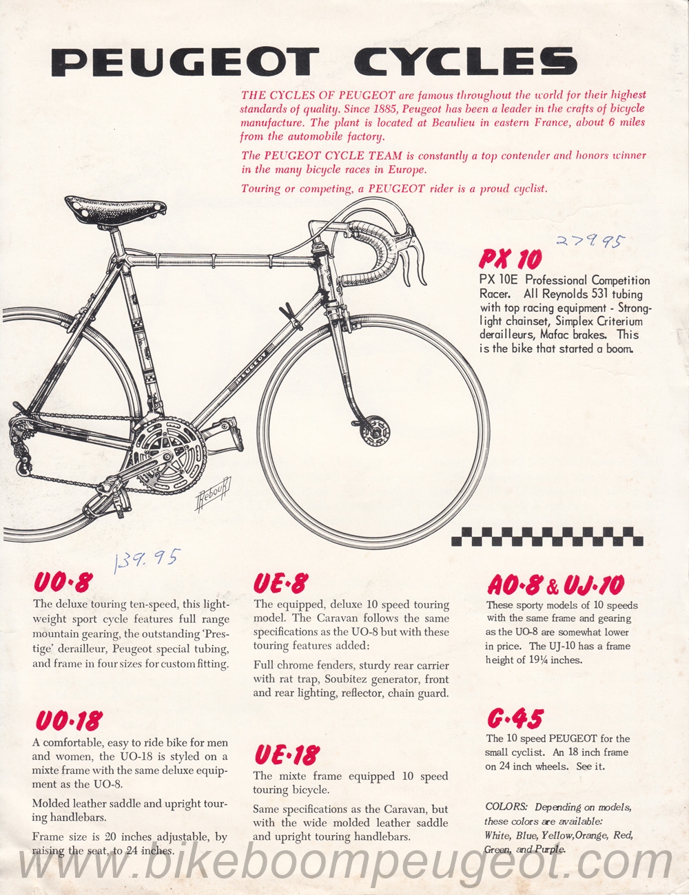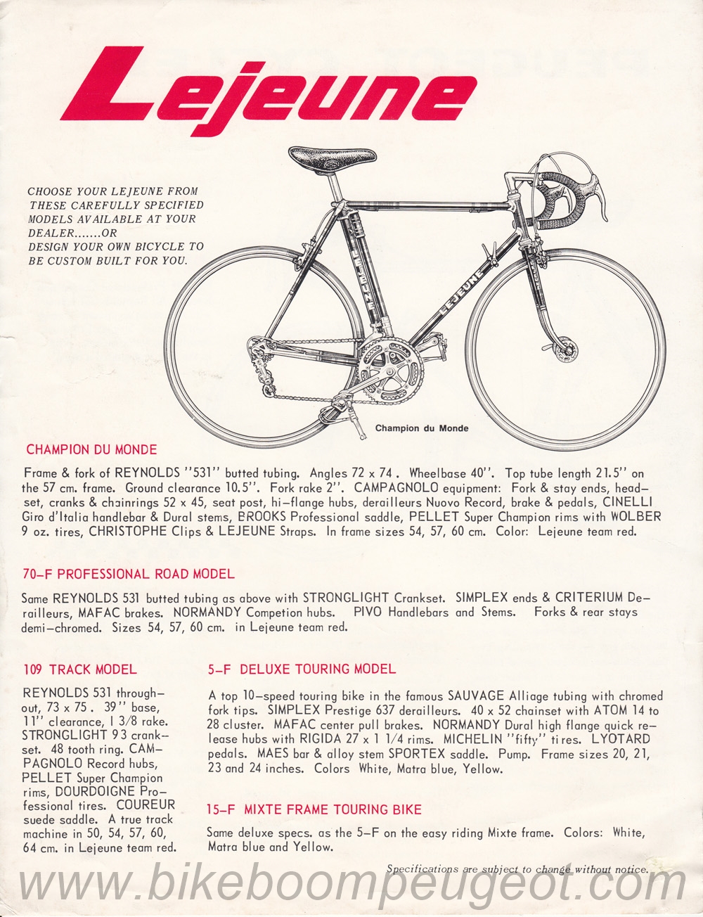 This is an early 1970's flyer, probably 1971. This dating is based on the decal combination and components of the Peugeot PX10 (see Peugeot PX10 Evolution webpage) and Lejeune Champion du Monde (see Velo-Pages Lejeune 1971-1972 brochure).
