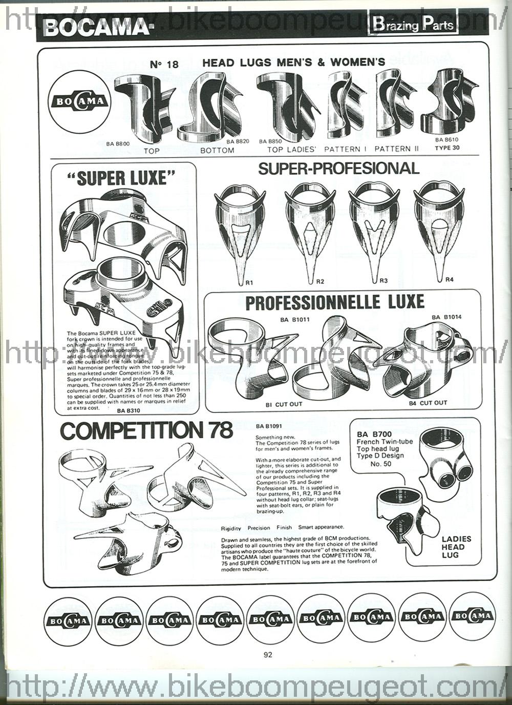 Photodocumentation of the chronology of Peugeot headbadge and decal schemes for the UO8 and PX10 models during the bike boom in the United States, as well as literature on the tubing and lugs used to make the frames.