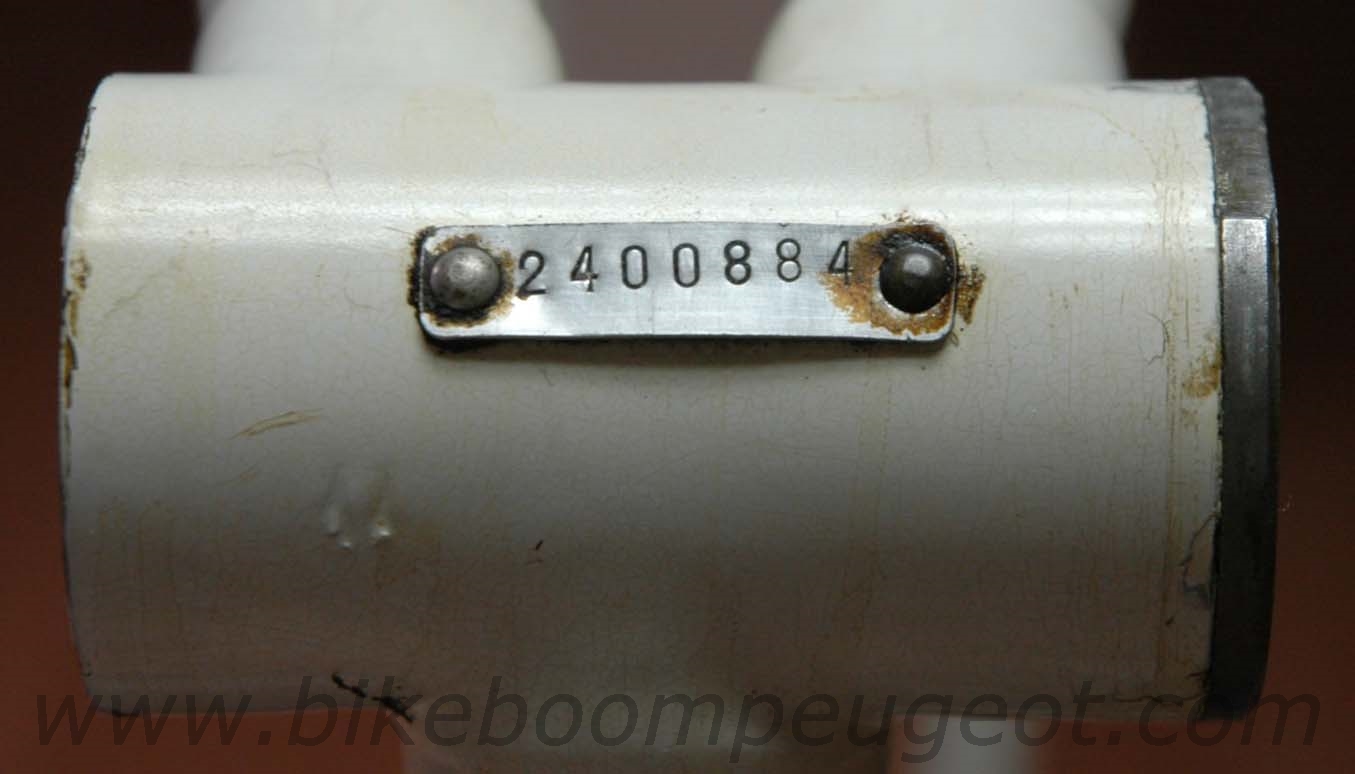 Older bicycles have a serial number on the underside of the bottom bracket. If the number has six digits the frame was probably made in the 1960s, seven digits in the 1970s. Sometimes, the first digit indicates the year within each decade that the frame was made. For example, 1940481 and 2400884 represent 1971 and 1972, respectively. However, there are many cases when the first digit suggests a frame production year that is older than the actual age of the bicycle. For example, the serial number 1355592 on a 1975 bicycle. The reverse has not been documented, so it is likely that bicycles are no older than the first digit in the factory serial number, but could be younger. Sometimes local bike shops etched serial numbers into the rear dropout, but this number may or may not match the original.